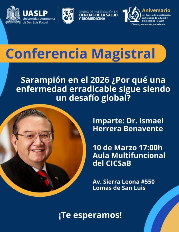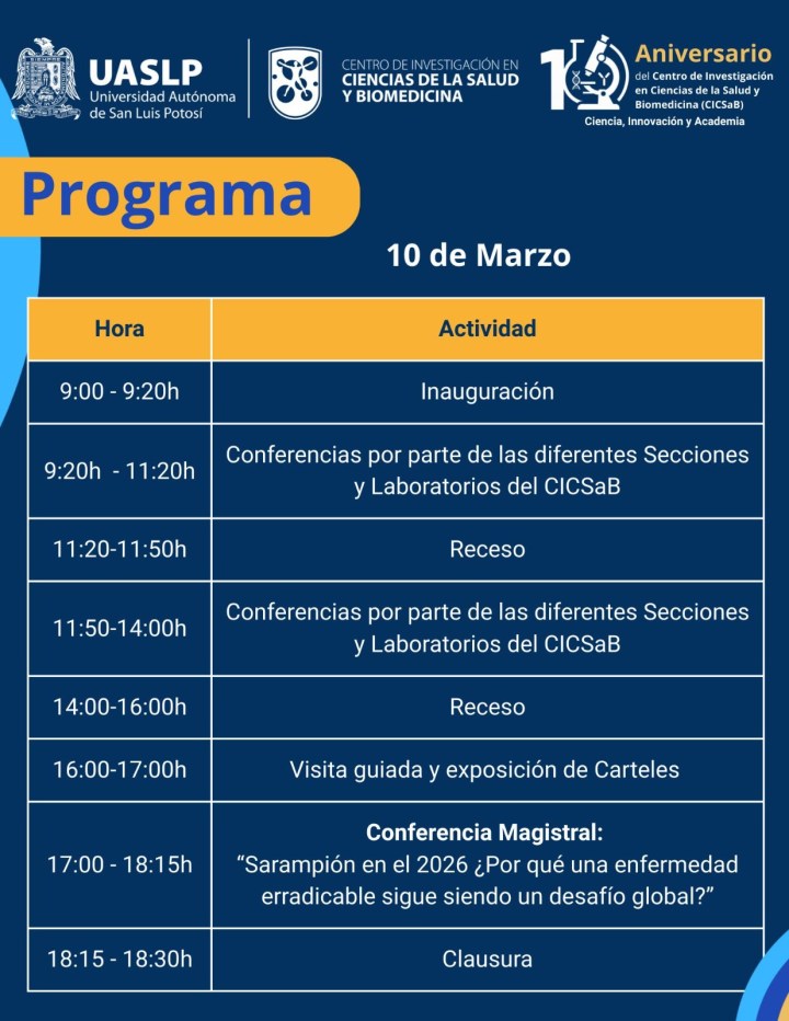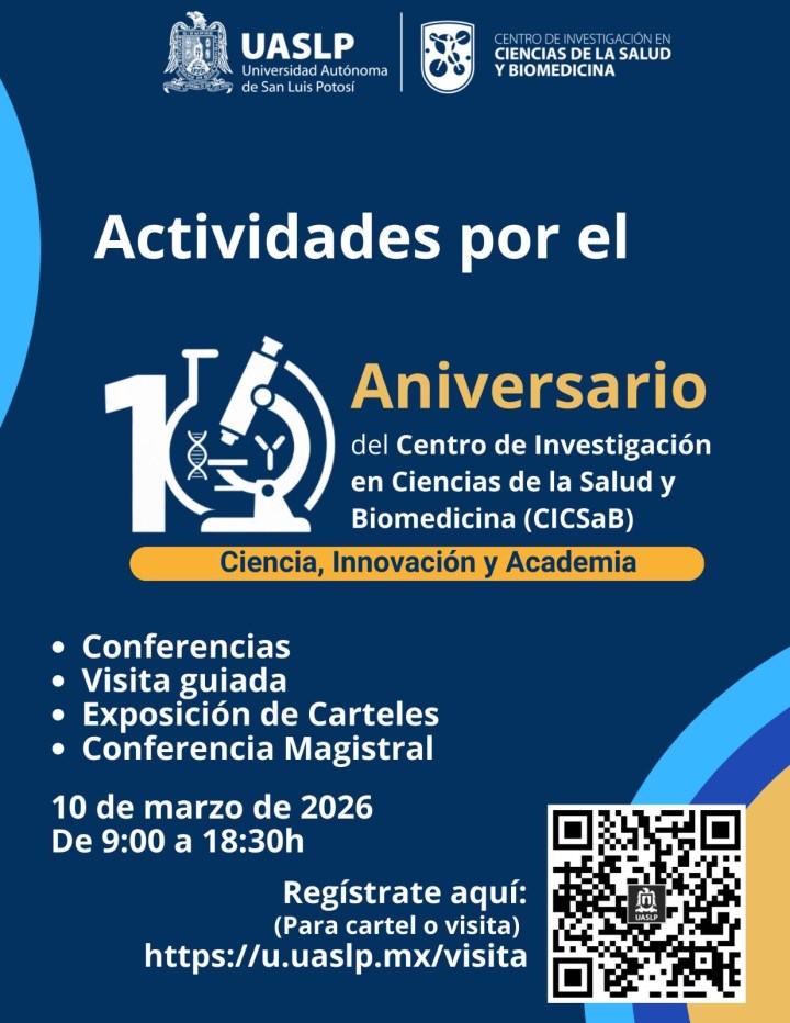 El Centro de Investigación en Ciencias de la Salud y Biomedicina (CICSaB) de la Universidad Autónoma de San Luis Potosí (UASLP) conmemora su décimo aniversario con un programa de actividades académicas y de divulgación que buscan destacar la relevancia de la investigación científica en la atención de problemas de salud y su impacto directo en la sociedad.