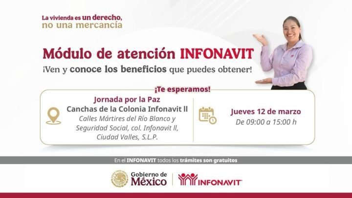 El INFONAVIT instalará módulos de atención en Ciudad Valles y San Luis Potosí capital, el próximo jueves 12 de marzo, de 09:00 a 15:00 horas, con el fin de asesorar a las y los trabajadores interesados en obtener un crédito y ofrecer alternativas de pago a quienes enfrentan dificultades para cubrir sus mensualidades.