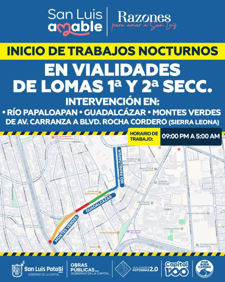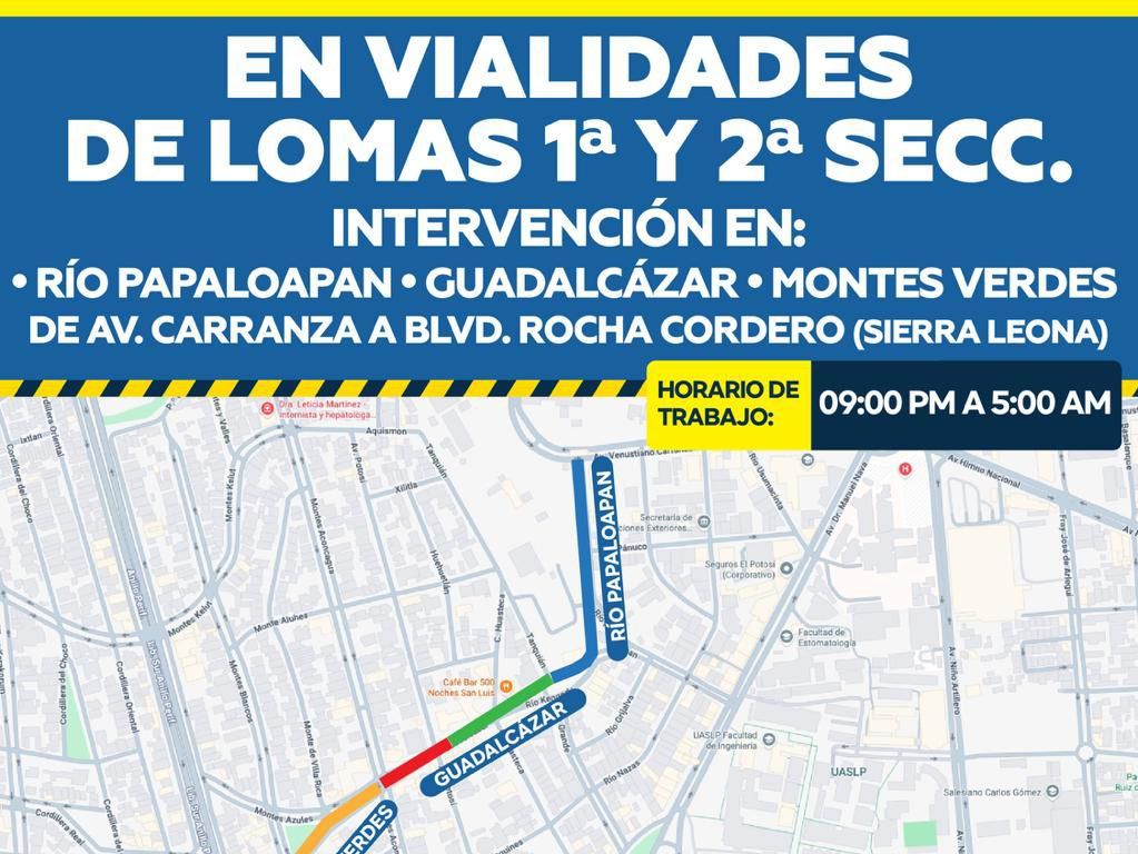 A través de la Dirección de Obras Públicas, constructores potosines realizarán intervenciones en las calles Río Papaloapan, Guadalcázar y Montes Verdes, ubicadas en las colonias Lomas Primera y Segunda Sección, en el tramo que conecta desde el Periférico Bulevar Antonio Rocha Cordero hasta la avenida Venustiano Carranza.