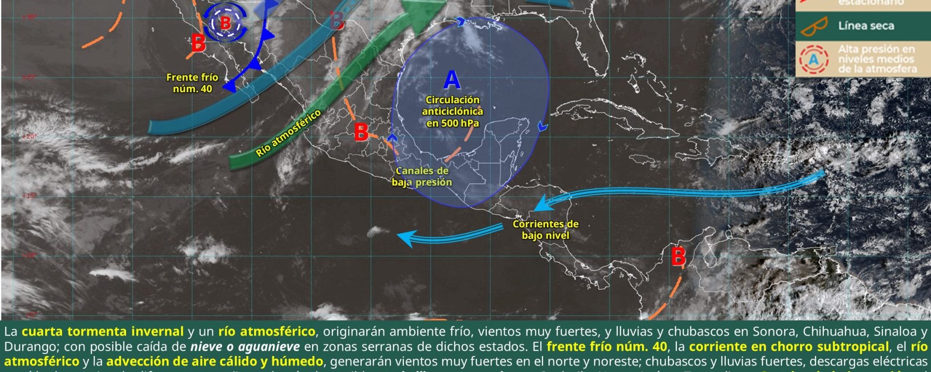 Posible caída de nieve o aguanieve: sierras de Sonora, Chihuahua, Sinaloa (norte) y Durango (norte).