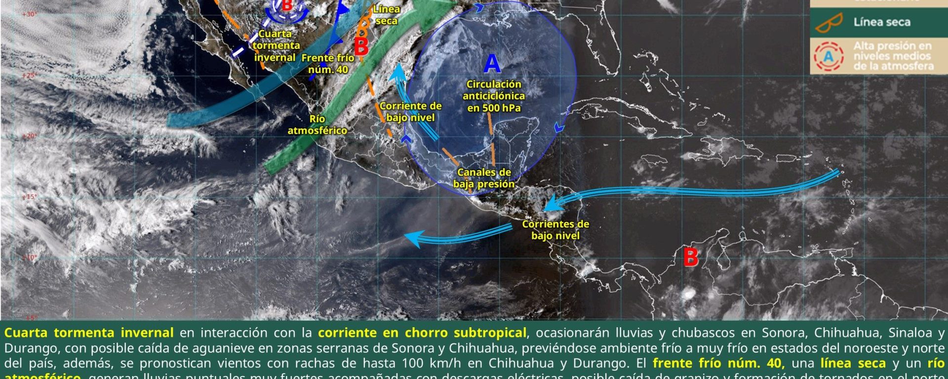 Viento de 20 a 30 km/h con rachas de 40 a 60 km/h: Baja California, Sonora, Chihuahua, Durango, Sinaloa, Nayarit, Jalisco, Colima, Michoacán, Guerrero, Oaxaca, Chiapas, Zacatecas, Aguascalientes, Guanajuato, Querétaro, Hidalgo, Puebla, Veracruz, Tabasco, Campeche, Yucatán y Quintana Roo.