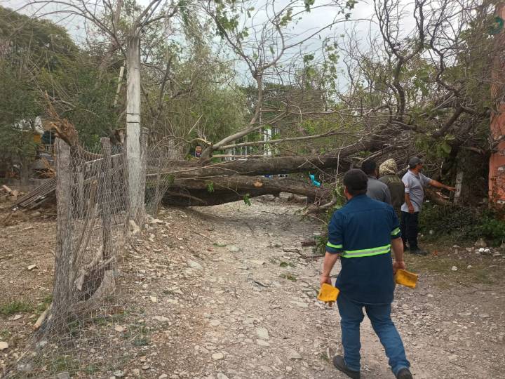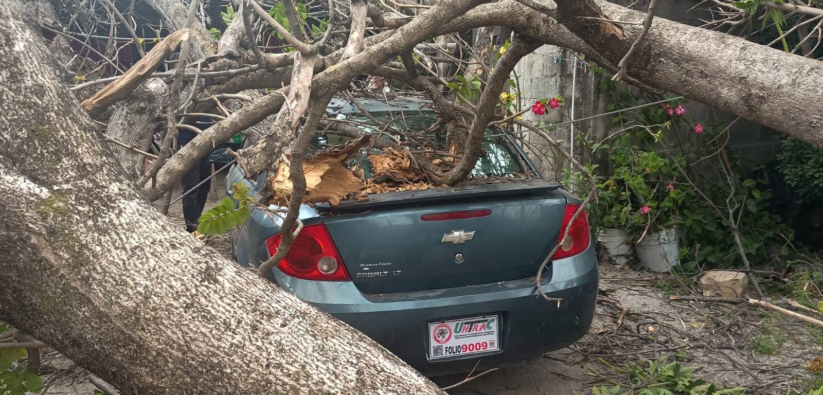 El primer incidente se registró en la colonia Emiliano Zapata, donde un árbol cayó sobre una vivienda, alcanzando también a un vehículo que se encontraba en el lugar, lo que generó únicamente daños materiales.