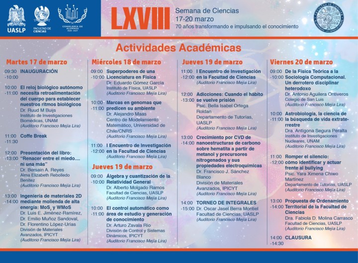 Con una agenda que combina actividades académicas, culturales y recreativas, este 17 de marzo dio inicio la LXIII Semana de Ciencias en la Facultad de Ciencias de la Universidad Autónoma de San Luis Potosí (UASLP) evento que se desarrollará hasta el próximo 20 de marzo con la participación de estudiantes, docentes e invitados especiales.