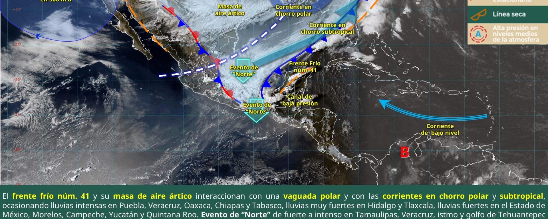 Evento de “Norte” de 60 a 70 km/h con rachas de 80 a 100 km/h: istmo y golfo de Tehuantepec (Oaxaca y Chiapas); de 40 a 50 km/h con rachas de 60 a 80 km/h: Veracruz, Tabasco, Campeche, Yucatán y Quintana Roo (norte); y de 10 a 20 km/h con rachas de 30 a 50 km/h, durante la mañana: Tamaulipas.