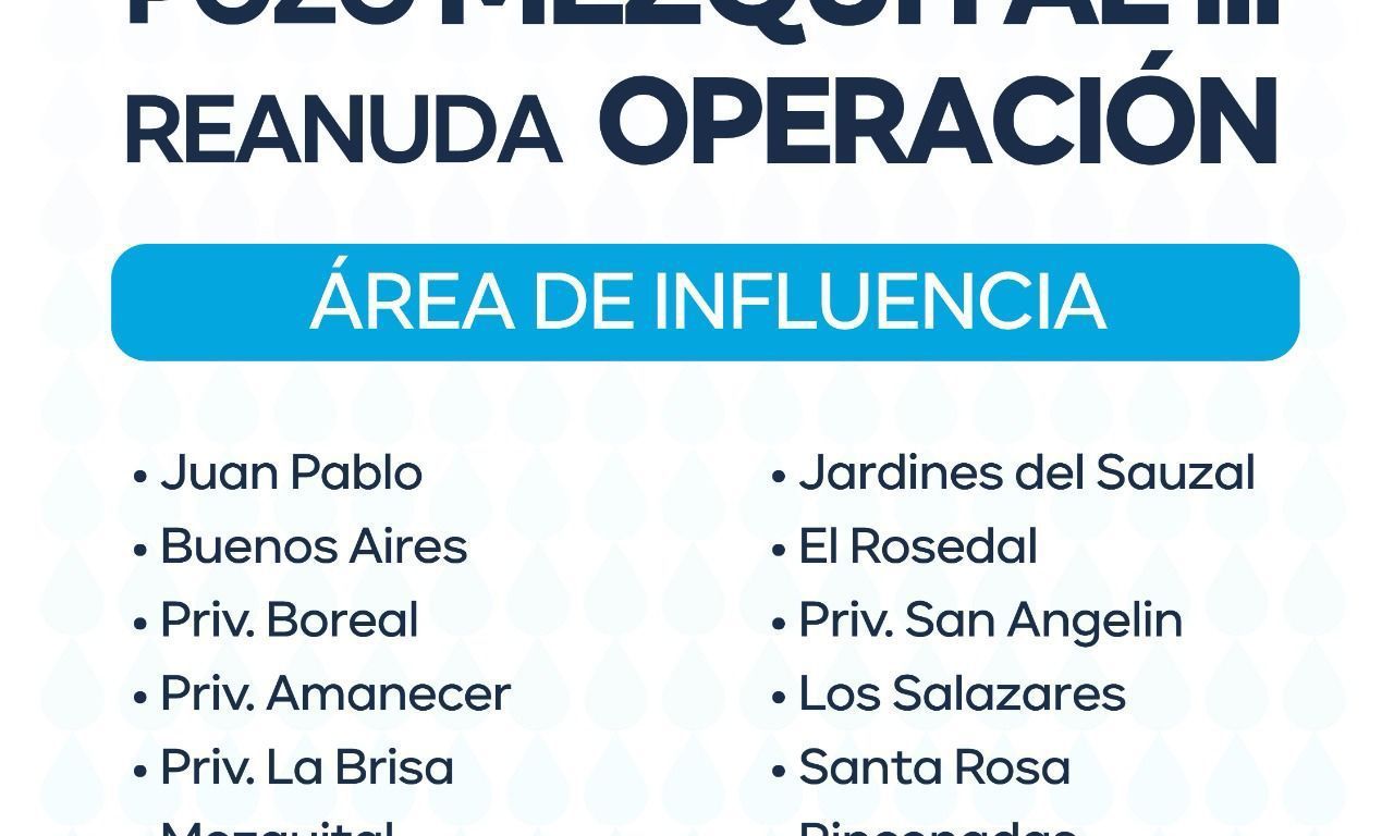 Con estas acciones, el suministro de agua comenzará a recuperarse de forma gradual dentro de las próximas 48 a 72 horas, en las colonias Haciendas de Jacarandas, Arboledas de Jacarandas, Juan Pablo, Buenos Aires, Privada Boreal, Privada Amanecer, Privada La Brisa, Mezquital, Condado del Sauzal, Jardines del Sauzal, El Rosedal, Privada San Angelín, Los Salazares, Santa Rosa y fraccionamiento Rinconadas.