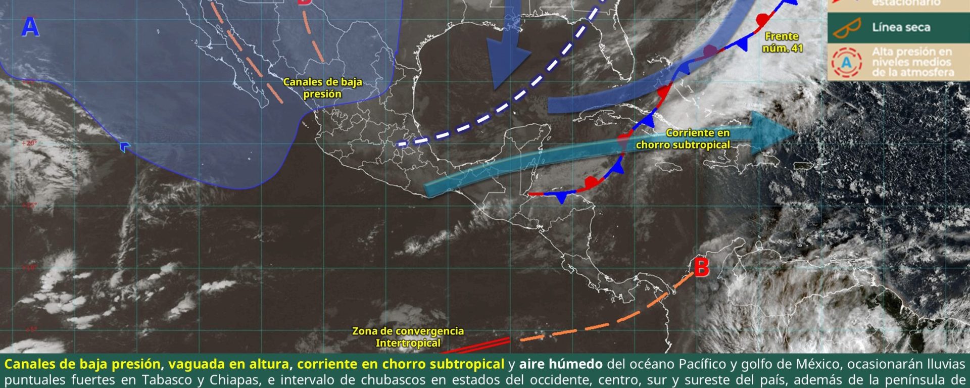 Chubascos con lluvias puntuales fuertes (25 a 50 mm): Tabasco y Chiapas.