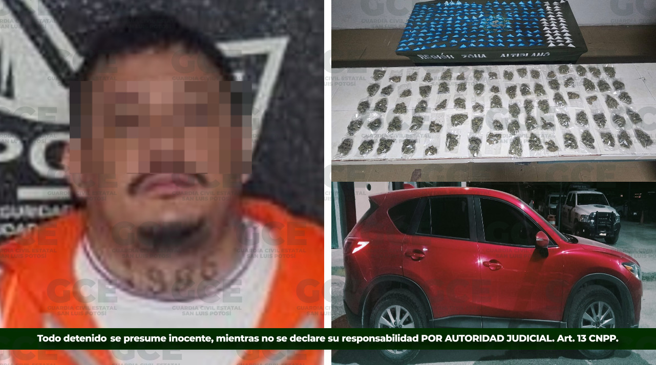 • La Guardia Civil Estatal detuvo a una pareja de presuntos vendedores de narcóticos, con 320 dosis de estupefacientes en el altiplano potosino.