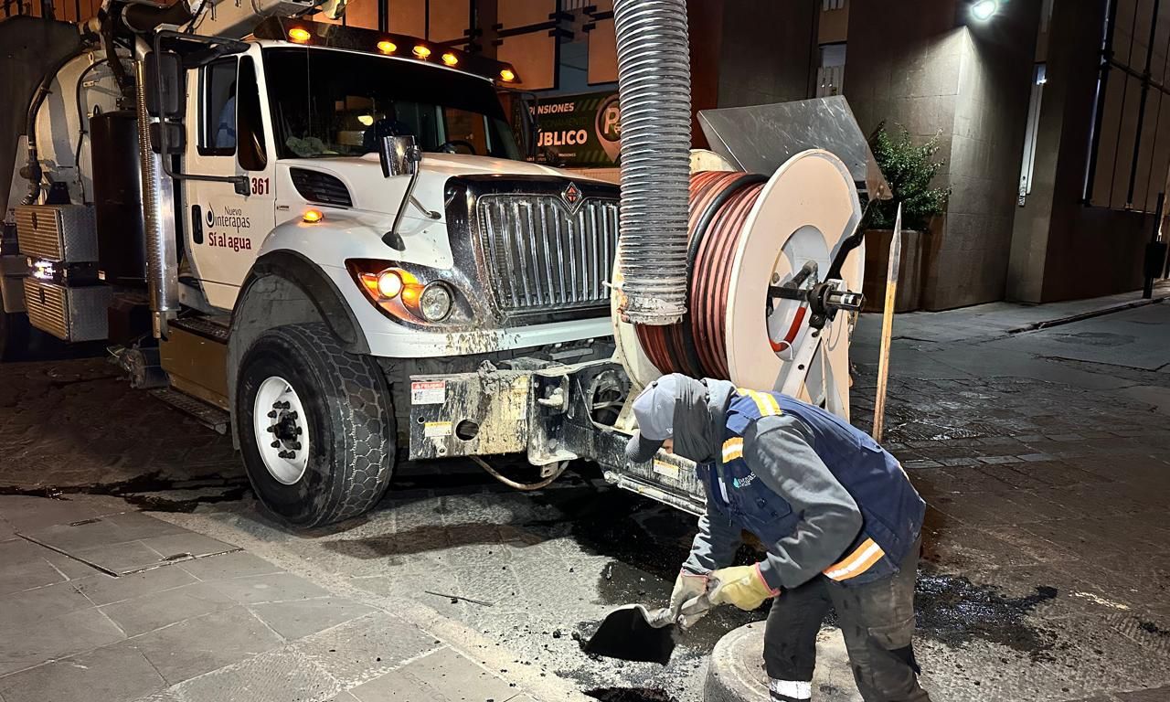 Estas acciones forman parte de la limpieza preventiva y las jornadas nocturnas de desazolve que realiza INTERAPAS para mantener en condiciones óptimas la red sanitaria durante las actividades en el Centro Histórico en Semana Santa y Pascua.
