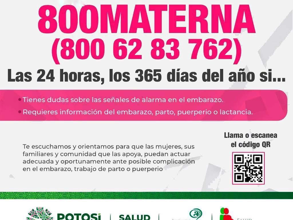 La línea telefónica 800 MATERNA (8006283762), opera por personal experto para apoyo a las mujeres embarazadas y familiares.