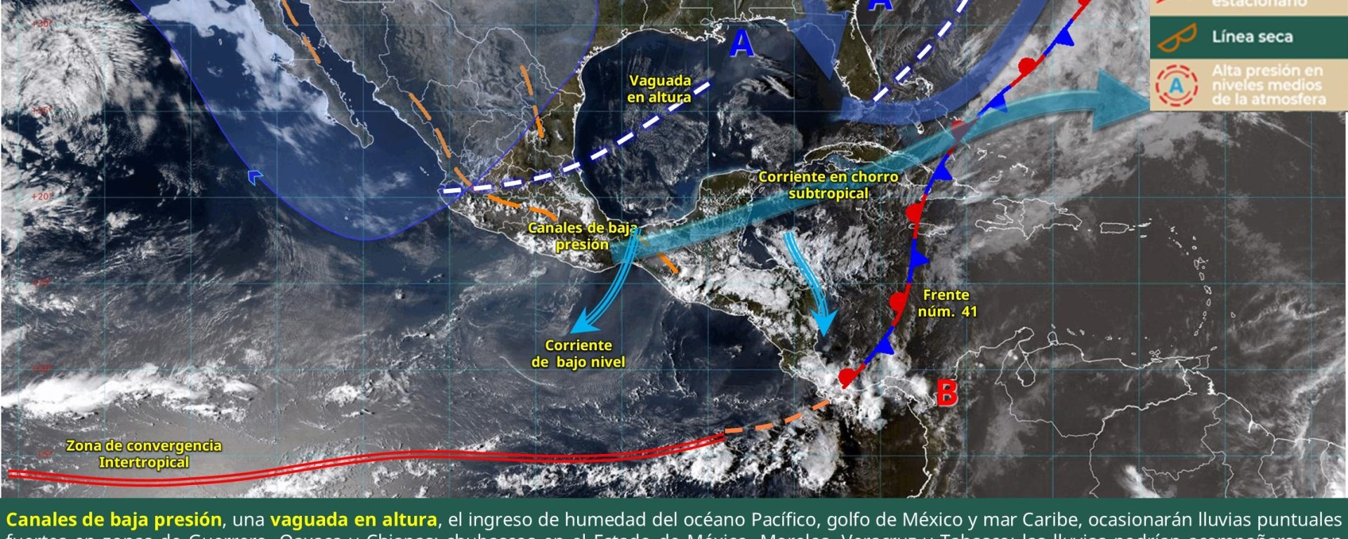 Lluvias aisladas (0.1 a 5 mm): Jalisco, Colima, Michoacán, Ciudad de México, Tabasco, Campeche, Yucatán y Quintana Roo.