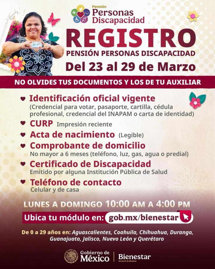 El delegado de San Luis Potosí, Guillermo Morales López, informó que, del 23 al 29 de marzo, se realiza el registro a la Pensión para el Bienestar de las Personas con Discapacidad derecho que consagra el artículo 4° de la Constitución mexicana y otorga 3 mil 300 pesos bimestrales de manera directa y sin intermediarios a través de la Tarjeta Bienestar.