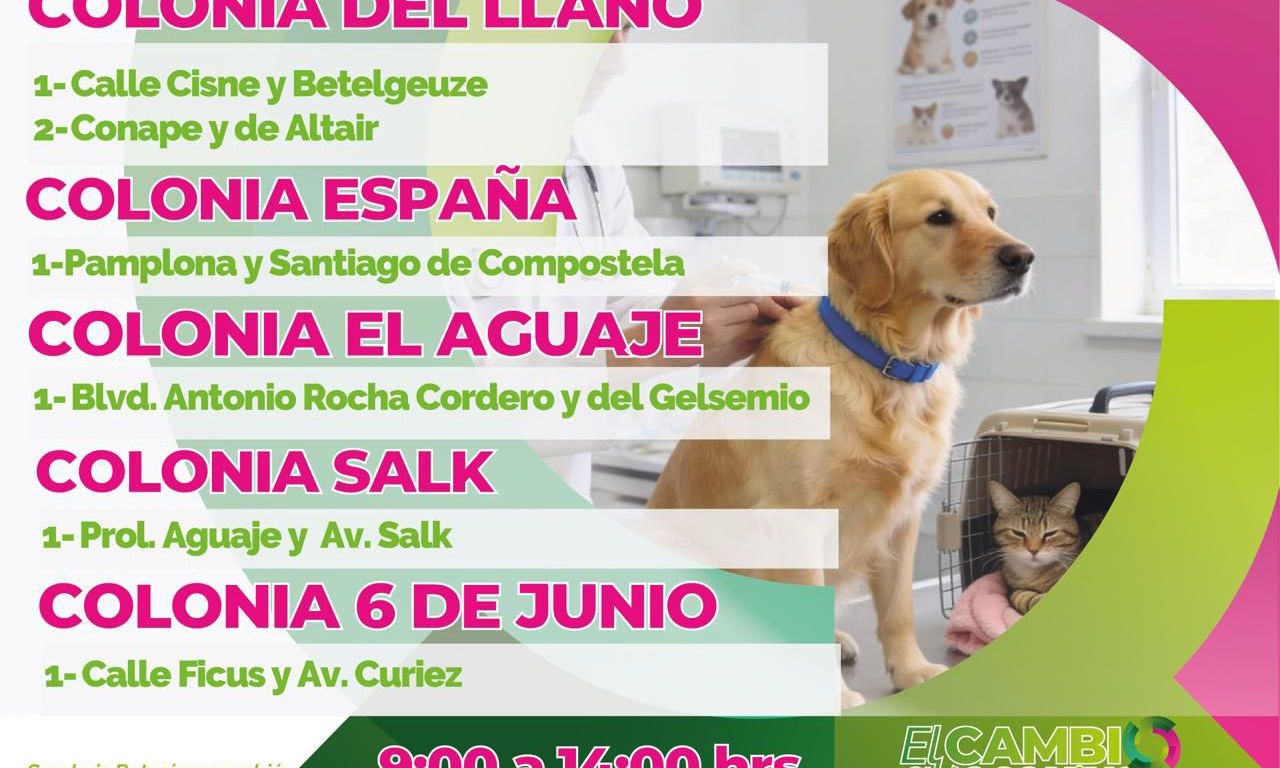 El sábado en los siguientes puntos: Colonia Del Llano en Calle Cisne y Betelgeuze y calle Conape y de Altair; Colonia España en calle Pamplona y Santiago de Compostela; Colonia El Aguaje en Blvd. Antonio Rocha Cordero y del Gelsemio; Colonia Salk en Prol. Aguaje y Av. Salk; Colonia 6 de junio en Calle Ficus y Av. Curie.