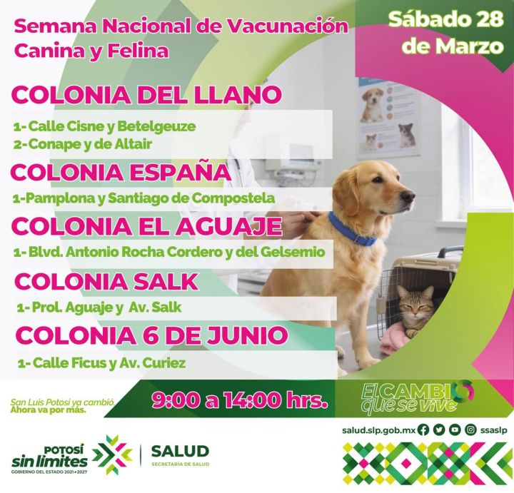 El domingo 29 de marzo acude a vacunar a tu perro o gato en: Ciclovía de Tequis en el Jardín de Tequis; Ciclovía Españita en calle Topacio esquina con Blvd. Españita; Colonia Progreso en Calle Ampere y Av. Curie, Calle Nobel y Av. Curie, Calle Tales de Mileto y Av. Curie y en la Colonia Valle del Potosí, en Calle Peral y Av. Curie.