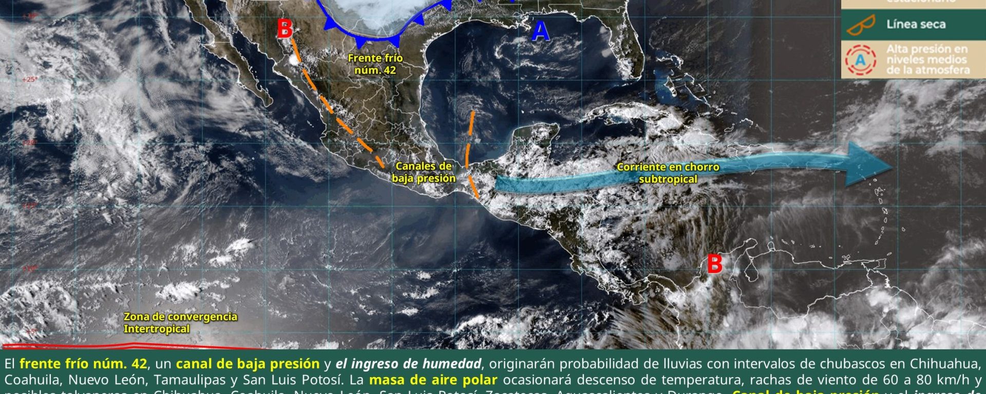 Viento de componente norte de 50 a 60 km/h con rachas de 70 a 90 km/h: istmo y golfo de Tehuantepec (Oaxaca y Chiapas); de 20 a 30 km/h con rachas de 40 a 60 km/h: Tamaulipas, Veracruz, Tabasco, Campeche, Yucatán y Quintana Roo.