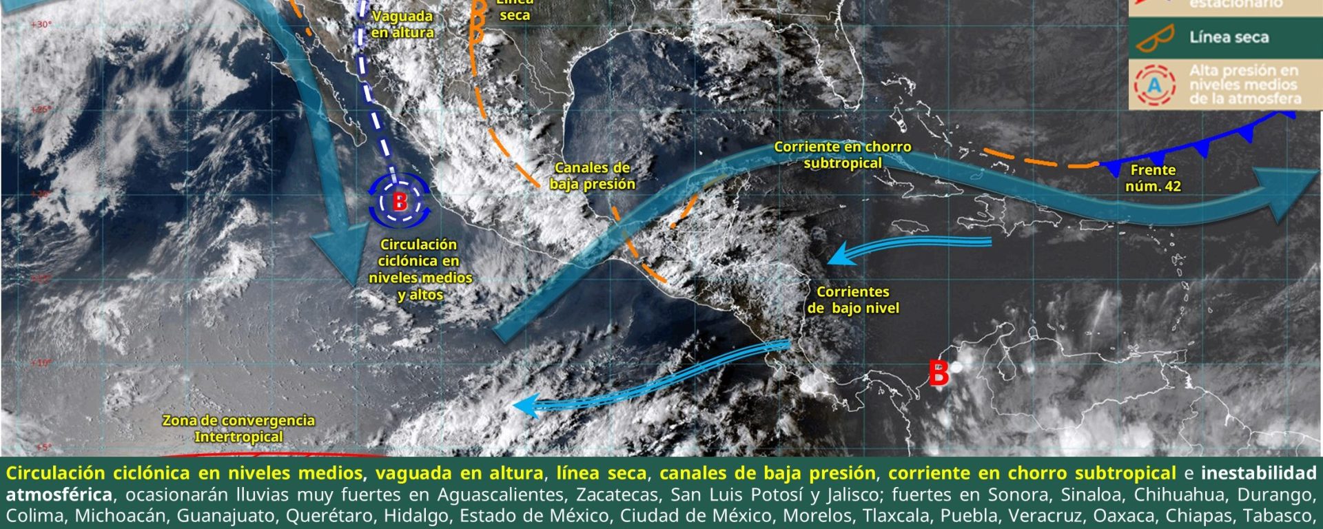 Viento de 10 a 20 km/h con rachas de 30 a 50 km/h: Baja California Sur, Zacatecas, San Luis Potosí, Aguascalientes, Jalisco, Michoacán, Guanajuato, Querétaro, Hidalgo, Estado de México, Ciudad de México, Tlaxcala, Morelos y Puebla.