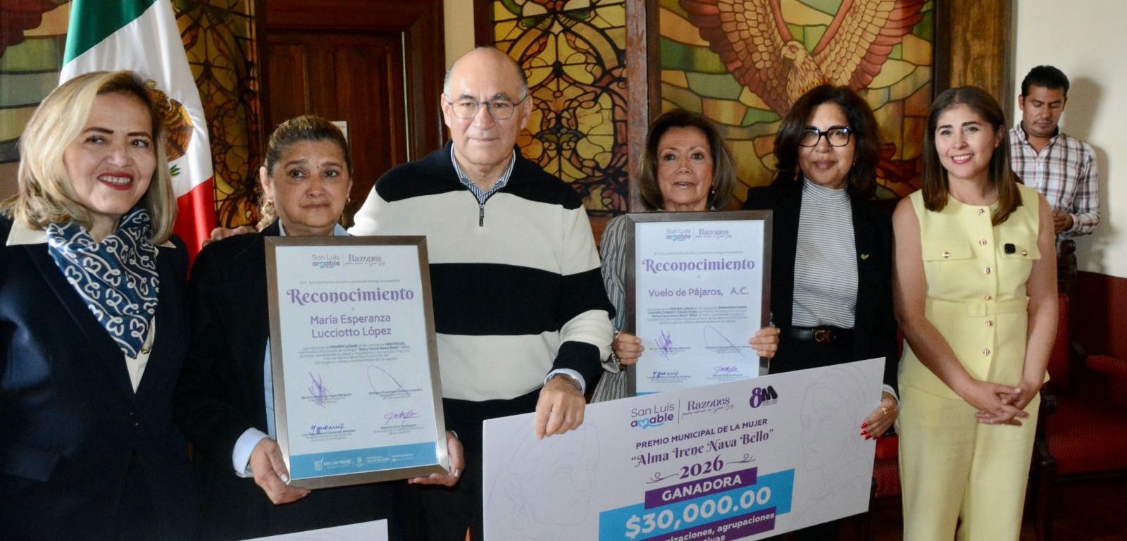 Debido a su contribución al desarrollo de las mujeres, así como por sus acciones sociales y de empoderamiento, el Cabildo en pleno de San Luis Potosí otorgó el Premio Municipal de la Mujer «Alma Irene Nava Bello» 2026, a María Esperanza Lucciotto López y a la asociación «Vuelo de Pajaros».