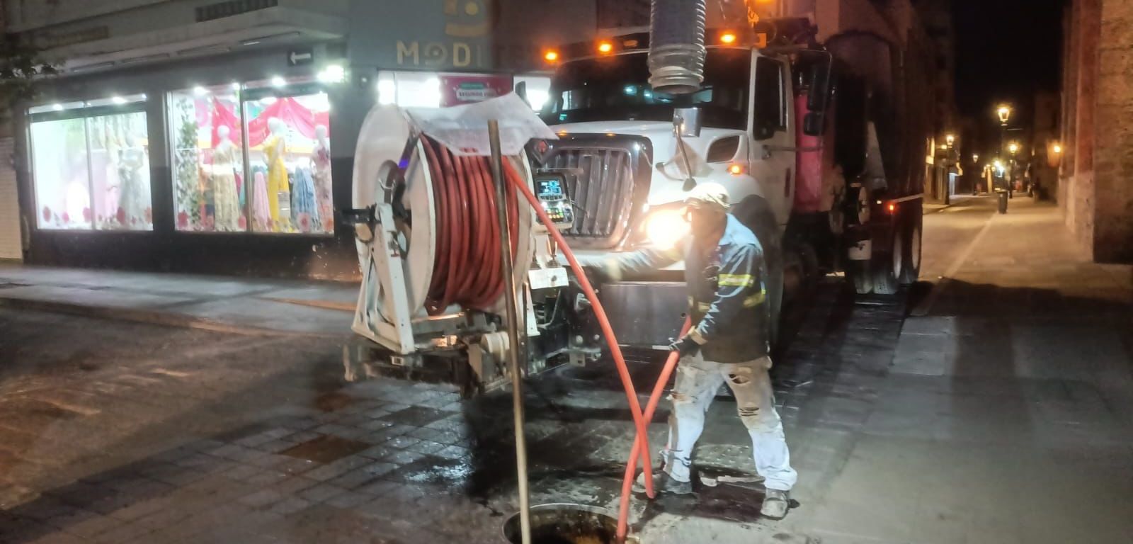 SLP.- De cara a la temporada de Semana Santa, INTERAPAS realizó una limpieza preventiva intensiva en la red sanitaria del Centro Histórico, para mantener en buenas condiciones esta zona de alta afluencia durante estas fechas.