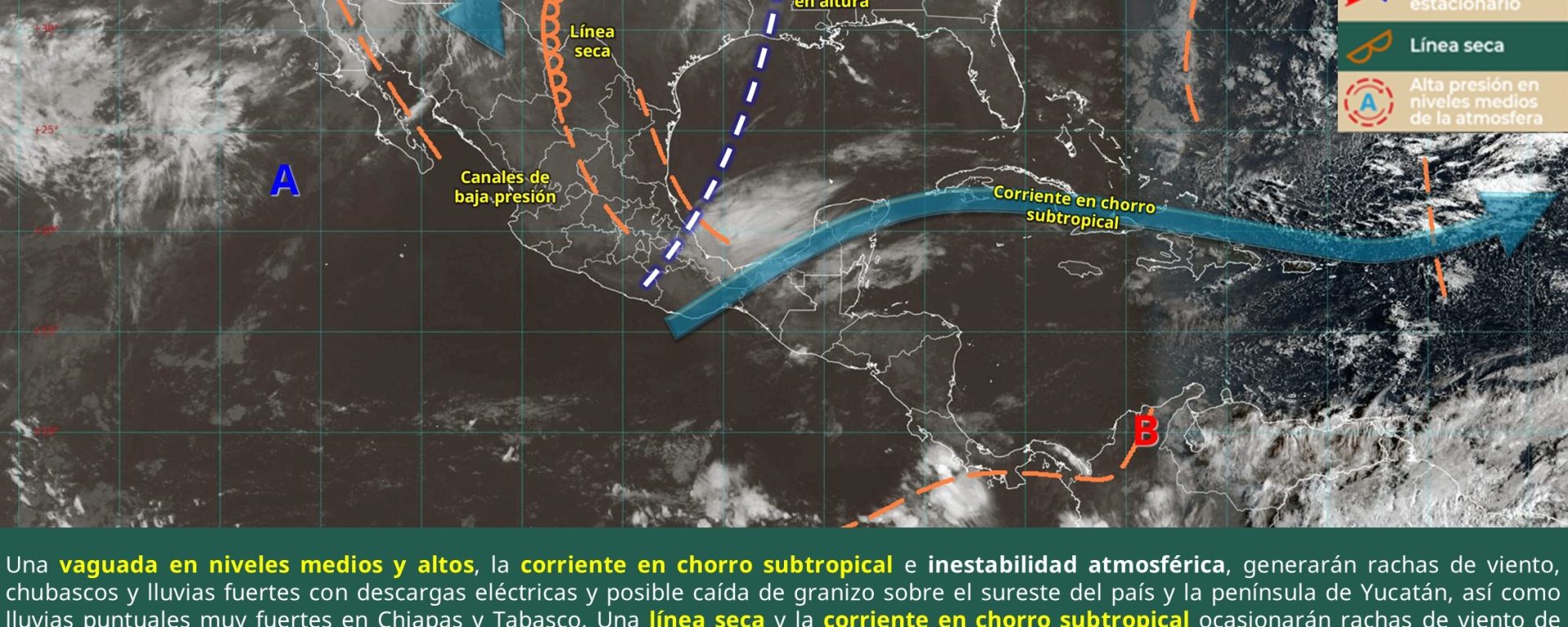 Viento de 30 a 40 km/h con rachas de 50 a 70 km/h: Baja California, Tabasco, Campeche, Yucatán y Quintana Roo; de componente sur: Tamaulipas; y con posible formación de torbellinos: Coahuila y Nuevo León (norte).
