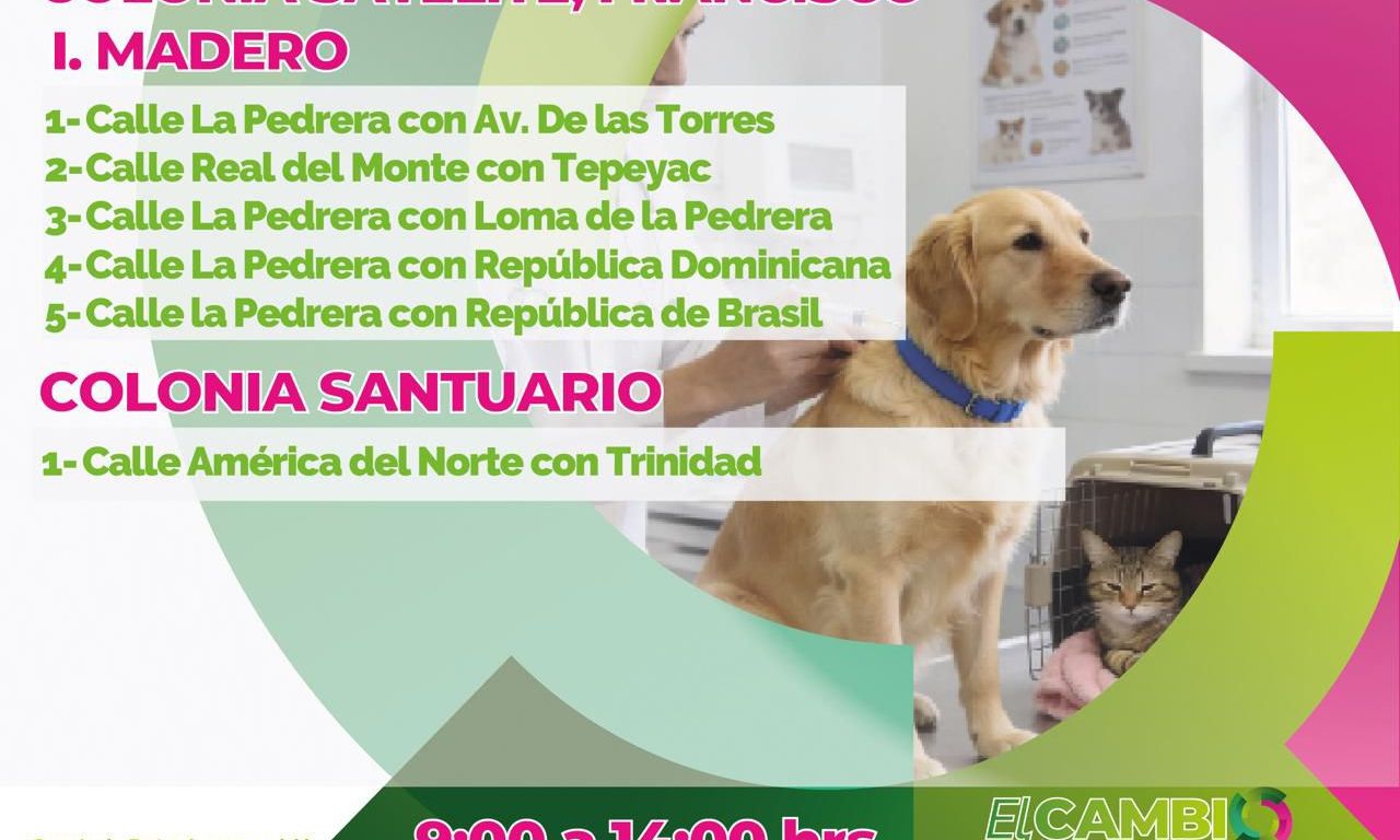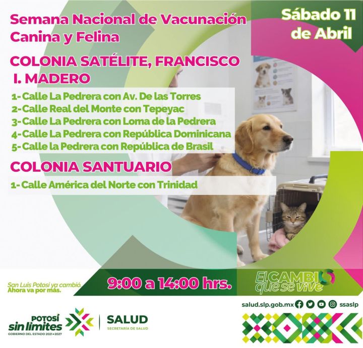 La vacunación, indicó se encuentra vigente porque la meta para el estado es aplicar 892 mil vacunas antirrábicas este año, por lo que hace un llamado a dueños y dueñas de mascotas a que acudan a los módulos de las brigadas de zoonosis para coordinar esfuerzos de protección animal y prevenir enfermedades zoonóticas en humanos. El médico veterinario, anunció que los puntos de la vacunación son publicados a través de las redes sociales de los Servicios de Salud, y que este fin de semana pueden acudir el sábado a la colonia Satélite, Francisco I. Madero en 5 puntos, y a un punto en la colonia Santuario; el domingo 12 de abril habrá brigadas en la colonia Santuario, la General I. Martínez, en el Jardín de Tequis y en la Ciclovía Españita (calle Topacio y Blvd. Españita).