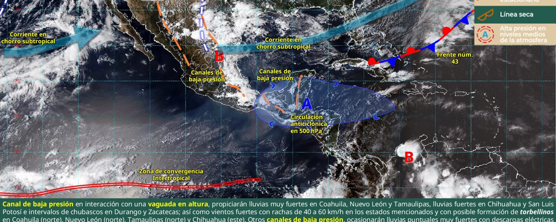 En el transcurso del día, cielo medio nublado a nublado. Por la mañana, ambiente frío a fresco con bancos de niebla en sierras de la región y muy frío a gélido con heladas en zonas serranas de Chihuahua y Durango. Durante la tarde, ambiente cálido. Lluvias puntuales fuertes acompañadas con descargas eléctricas y posible caída de granizo en Chihuahua (norte), Nuevo León (norte) y San Luis Potosí (sur), mismas que podrían ocasionar encharcamientos, inundaciones y deslaves, e incrementar los niveles de ríos y arroyos. Lluvias e intervalos de chubascos en Coahuila, lluvias aisladas en Durango y sin lluvia en Zacatecas y Aguascalientes. Viento de dirección variable de 20 a 30 km/h con rachas de 40 a 60 en Chihuahua, Coahuila, Nuevo León, San Luis Potosí, Aguascalientes, Zacatecas y Durango.
