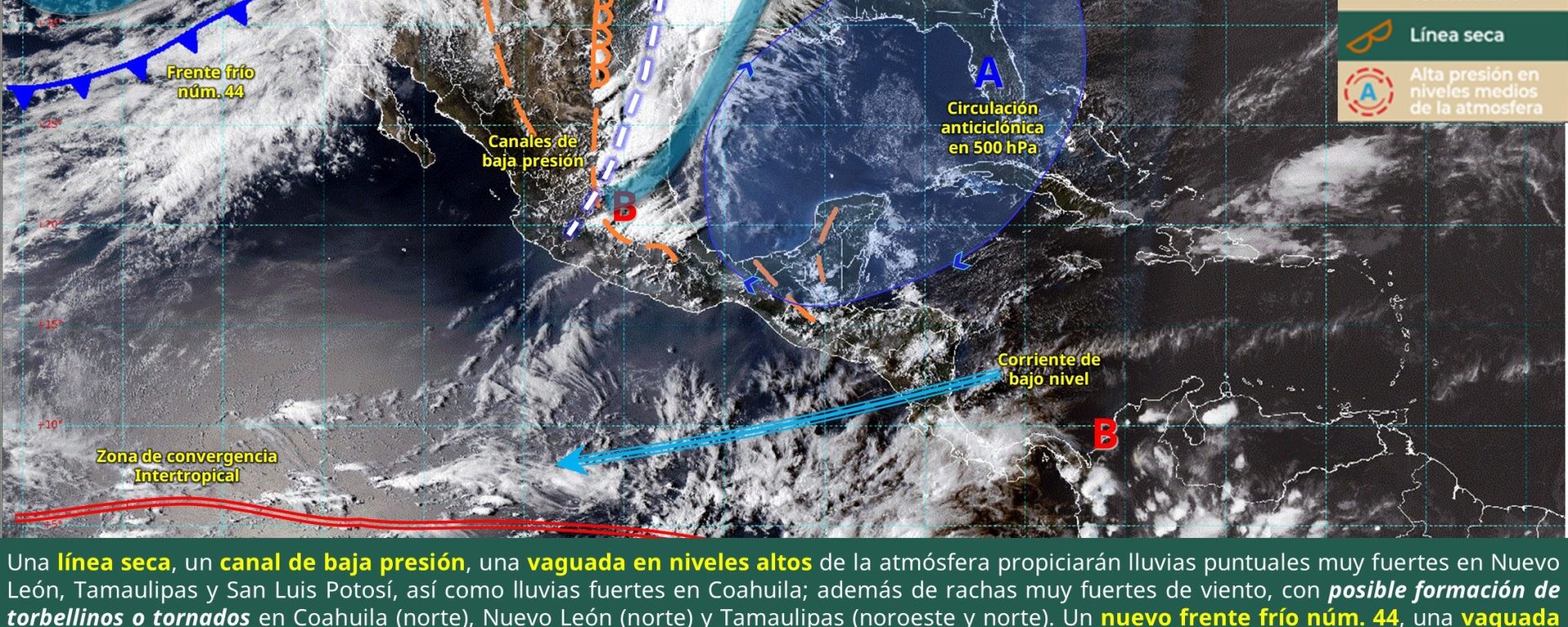 Viento de 40 a 50 km/h con rachas de 60 a 80 km/h y posibles tolvaneras: Baja California y Sonora; con posible formación de torbellinos: Chihuahua (noreste), Coahuila (norte), Nuevo León (norte) y Tamaulipas (noroeste).