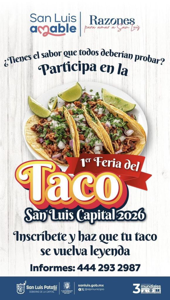 El Ayuntamiento de San Luis Potosí y el Presidente Municipal Enrique Galindo, invitan a toda la ciudadanía potosina a participar de la próxima Feria del Taco, San Luis Capital 2026. El gran evento se llevará a cabo los días Sábado 02 y Domingo 03 de mayo del año en curso en la tradicional Alameda Juan Sarabia, donde los asistentes podrán disfrutar de una amplia variedad de propuestas gastronómicas en un horario de 10:00 a 22:00 horas.