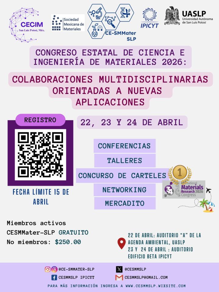 Investigadores de la Facultad de Ingeniería de la Universidad Autónoma de San Luis Potosí (UASLP) y del Instituto Potosino de Investigación Científica y Tecnológica (Ipicyt) invitaron a la comunidad académica a participar en el Congreso Estatal de Ciencia e Ingeniería de Materiales 2026, que se realizará del 22 al 24 de abril en ambas instituciones.