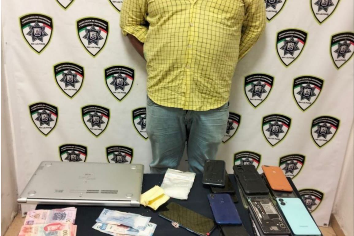 Durante la inspección preventiva del vehículo fueron localizados y asegurados un arma de fuego abastecida, cartuchos útiles, 17 gramos de cristal, 8 gramos de marihuana, asi como 21 equipos de telefonía móvil, una computadora portátil y dinero en efectivo, por lo que se activaron los protocolos correspondientes de cadena de custodia.