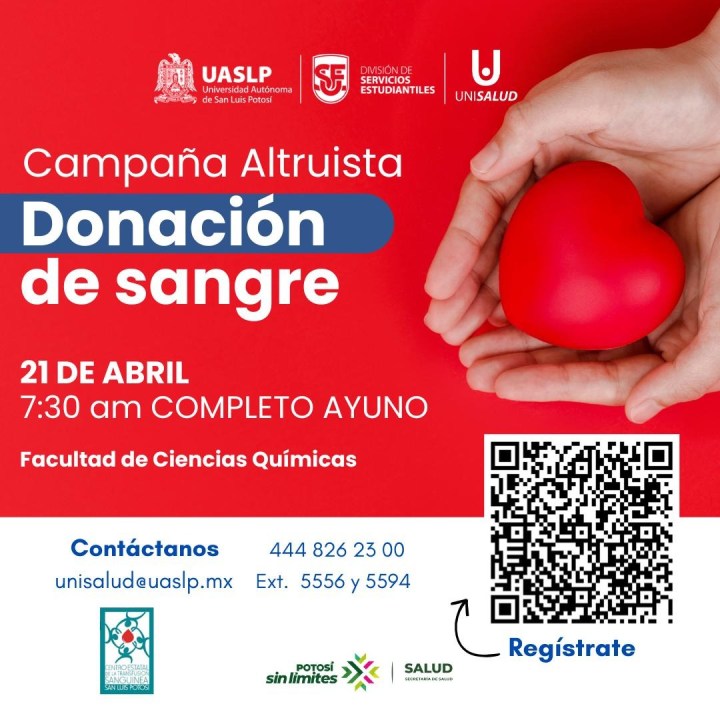 La Universidad Autónoma de San Luis Potosí (UASLP), a través de la División de Servicios Estudiantiles y Unisalud, llama a la comunidad universitaria y a la población en general a participar en la Campaña Altruista de Donación de Sangre que se realizará este martes 21 de abril a partir de las 7:30 horas en la Facultad de Ciencias Químicas.