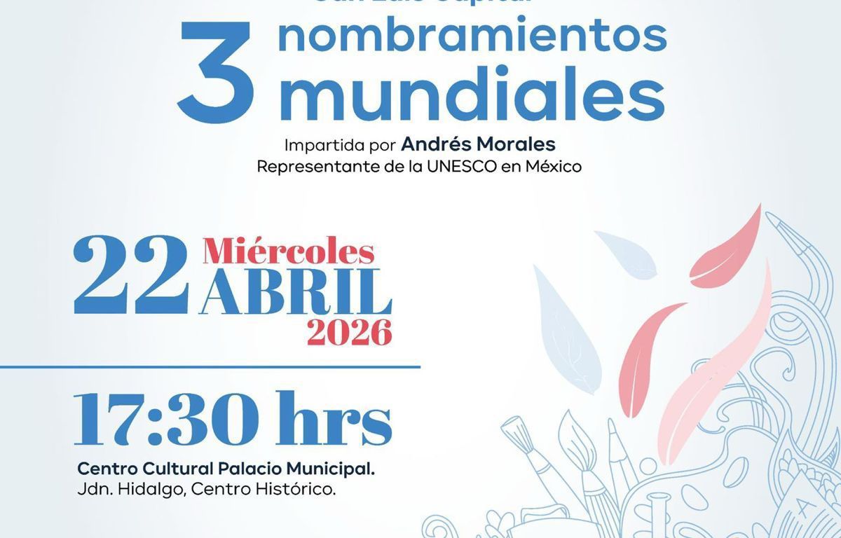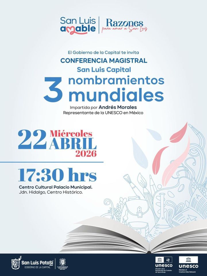El Ayuntamiento de San Luis Capital invita a la ciudadanía a la conferencia magistral “San Luis Capital: 3 nombramientos mundiales”, que será impartida por Andrés Morales, representante de la UNESCO en México, como parte de las acciones para fortalecer la proyección internacional de la ciudad.
