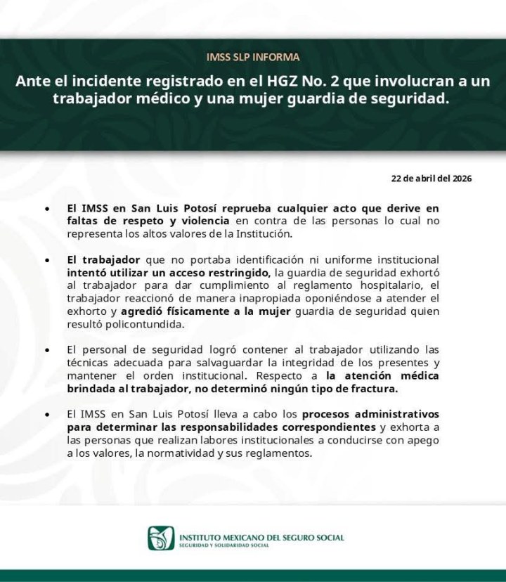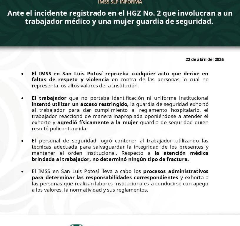 Ante el incidente registrado en el Hospital General de Zona (HGZ) No. 2 que involucran a un trabajador médico y una guardia de seguridad, la Representación del Instituto Mexicano del Seguro Social (IMSS) en SLP informa:
