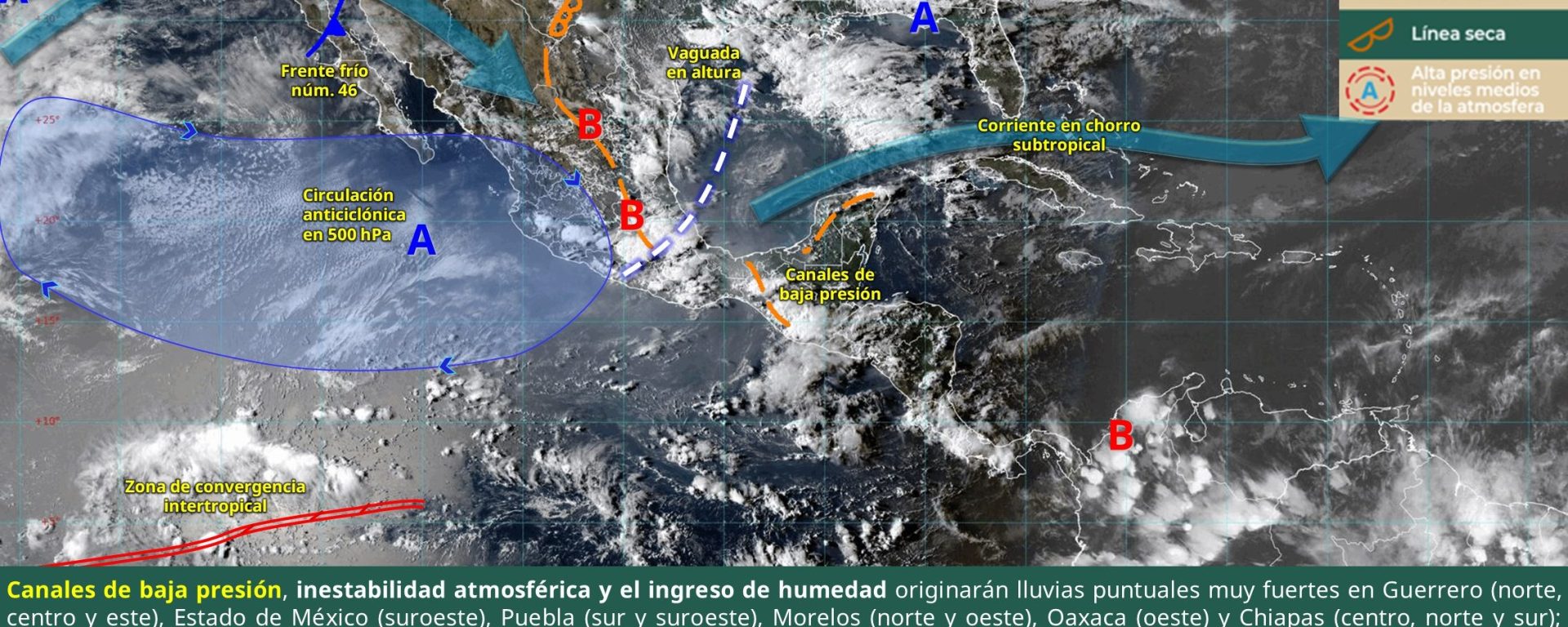 Chubascos con lluvias puntuales fuertes (25 a 50 mm): Coahuila (norte), Puebla (sur y suroeste), Guerrero (este y noreste), Oaxaca (centro, norte y noroeste) y Chiapas (centro y sur).