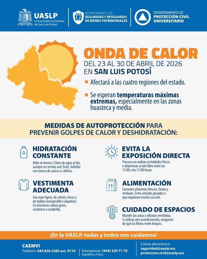El Laboratorio Nacional de Variabilidad Climática, Teledetección y Evaluación de Riesgos (Variclim) y el área de Protección Civil Universitario de la Universidad Autónoma de San Luis Potosí (UASLP) advirtieron sobre la presencia de una onda de calor que impactará las cuatro regiones del estado, derivada de un sistema de alta presión. De acuerdo con el pronóstico, se esperan temperaturas máximas muy elevadas en los próximos días, con mayor intensidad en las zonas Huasteca y Media.