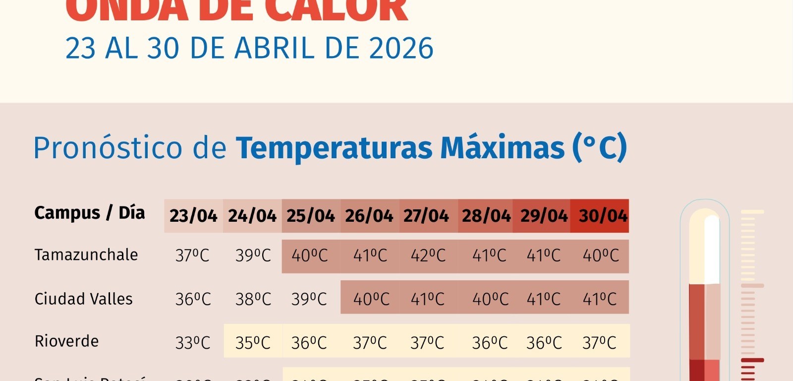 Con base en los datos generados por Variclim, el reporte contempla el comportamiento térmico del 23 al 30 de abril en seis localidades: Tamazunchale, Ciudad Valles, Rioverde, San Luis Potosí, Matehuala y Salinas de Hidalgo. Los registros indican que Tamazunchale y Ciudad Valles serán los puntos más calurosos, con valores que oscilarán entre los 36 y hasta los 42 grados Celsius.