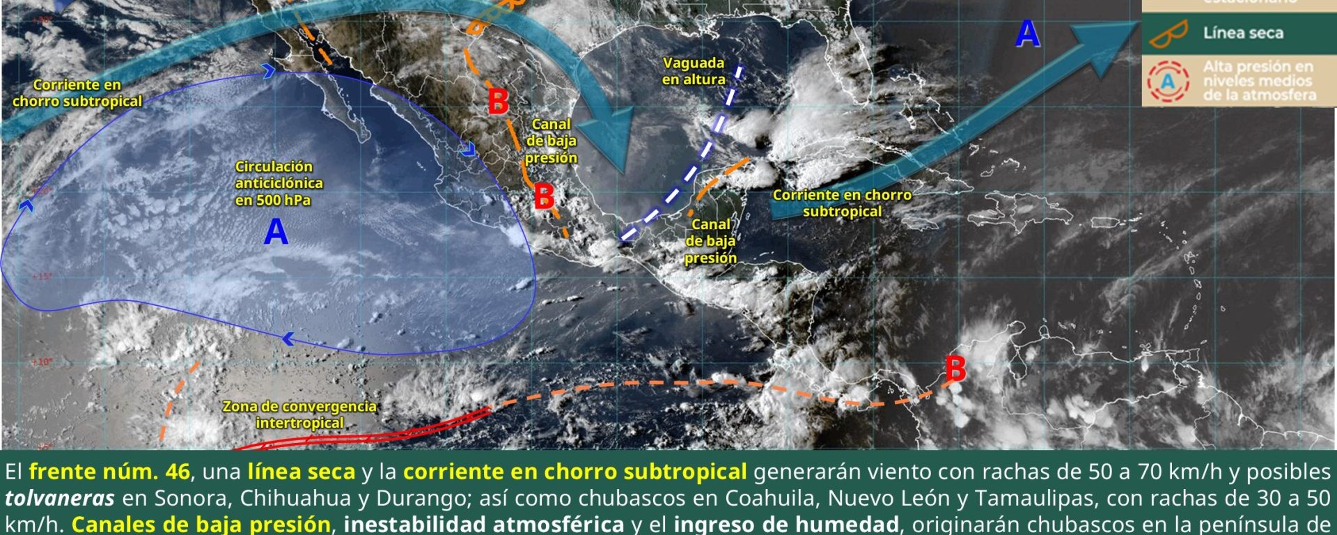 Viento de 10 a 20 km/h con rachas de 30 a 50 km/h: Baja California Sur, Sinaloa, Nayarit, Jalisco, Colima y Michoacán; y con posibles tolvaneras: Coahuila, Nuevo León, Tamaulipas, San Luis Potosí, Zacatecas, Aguascalientes, Guanajuato, Querétaro, Hidalgo, Campeche, Yucatán y Quintana Roo.