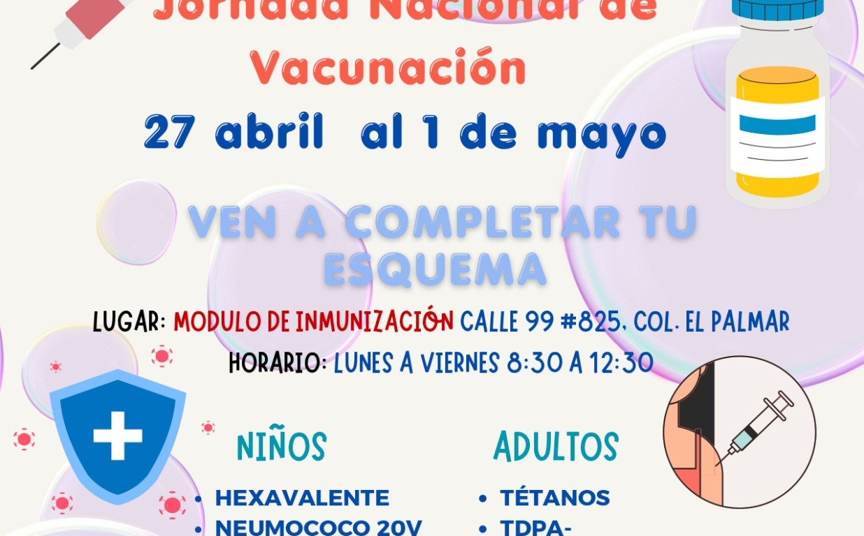 La jornada se desarrollará en el Módulo de Inmunización, ubicado en calle 99 #825, colonia El Palmar, en un horario de lunes a viernes de 8:30 a 12:30 horas, donde personal capacitado brindará atención a niñas, niños y personas adultas.