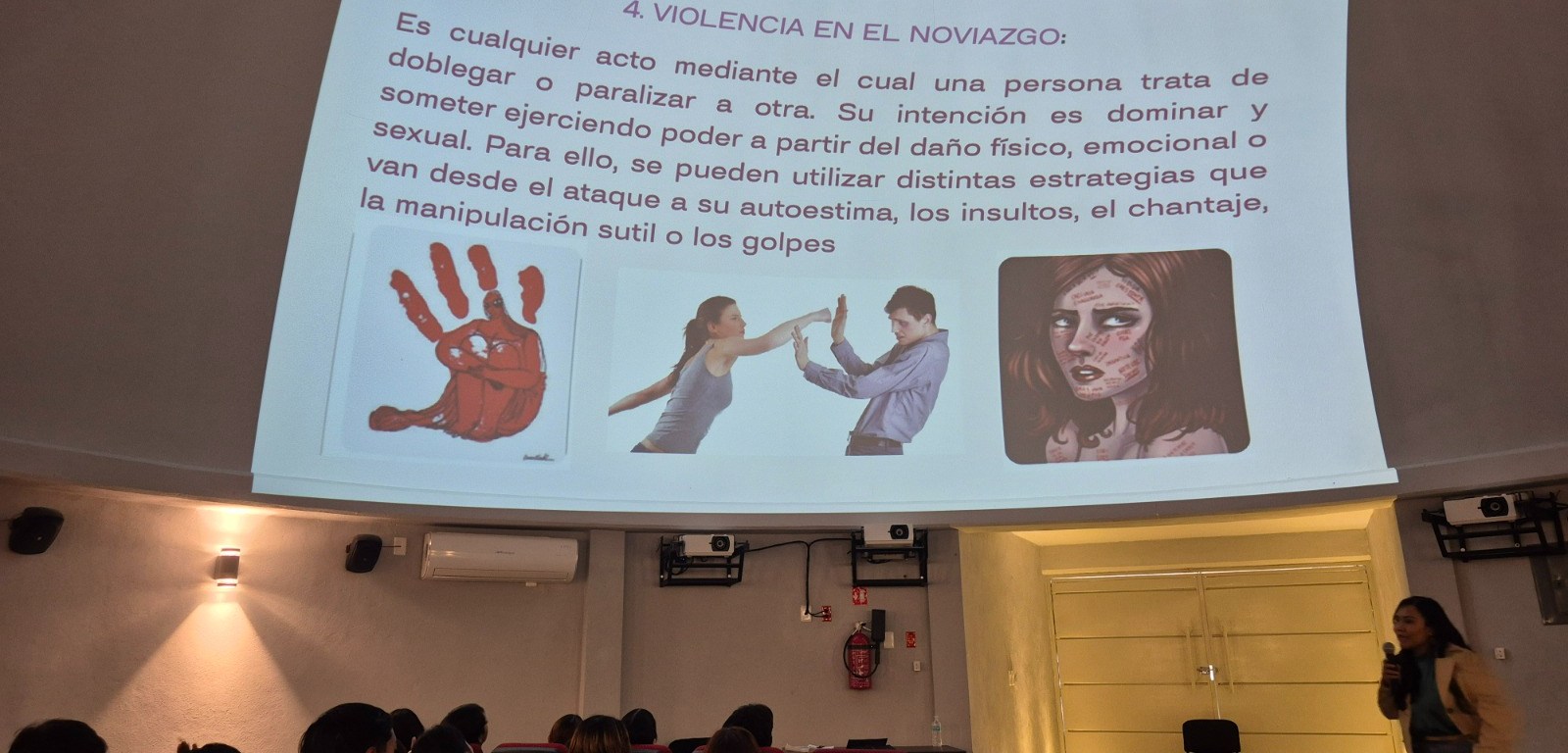 Durante su intervención, la ponente invitó a las personas participantes a cuestionar los conceptos de amor y noviazgo, así como a identificar qué se entiende por violencia en las relaciones afectivas. A partir de este ejercicio, se abordaron los distintos tipos de violencia que pueden presentarse, visibilizando conductas que en muchos casos son normalizadas.