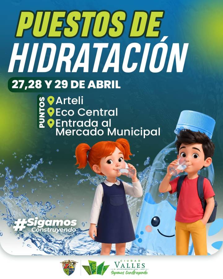 CIUDAD VALLES, S.L.P.– Derivado de la ola de calor que se registra en la región, y bajo la instrucción del Presidente Municipal David Armando Medina Salazar, se instalarán puestos de hidratación del lunes 27 al miércoles 29 de abril, con el objetivo de apoyar a la ciudadanía y prevenir afectaciones a la salud, como resultado del trabajo coordinado entre la Dirección de Protección Civil Municipal, Secretaría General y Servicios Municipales de Salud.