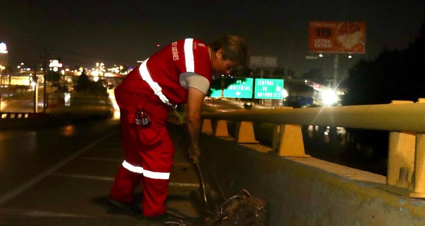 Mientras la ciudadanía descansaba, personal operativo hizo limpieza en la parte alta del Distribuidor Juárez; hoy, el personal de Imagen Urbana continúa con el mantenimiento de la Avenida México