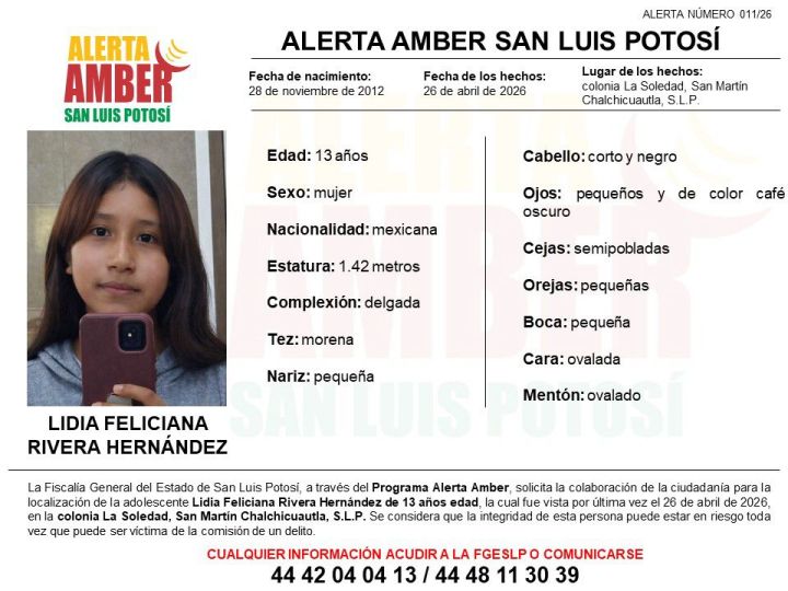 La Fiscalía General del Estado de San Luis Potosí (FGESLP) activó una ficha de Alerta Amber para la localización de Lidia Feliciana Rivera Hernández, de 13 años de edad, quien fue vista por última vez el 26 de abril de 2026 en la colonia La Soledad, en el municipio de San Martín Chalchicuautla.