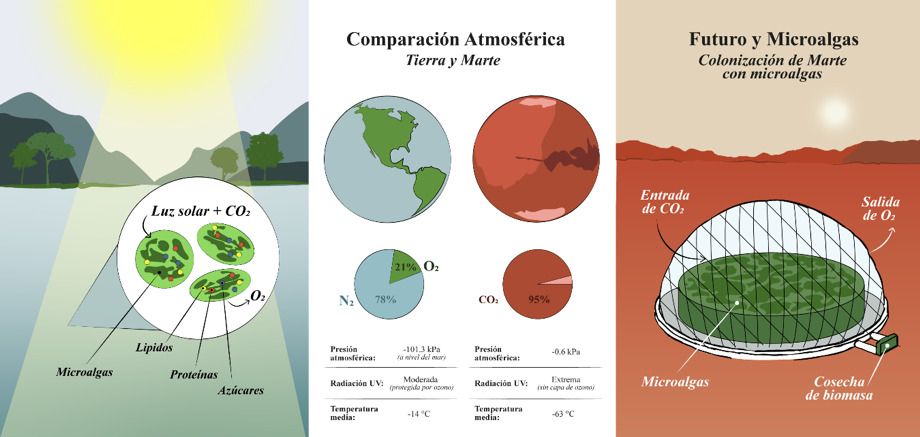 Las microalgas son organismos microscópicos que miden entre 2 y 50 µm; por ejemplo, una de 10 µm es varias veces más pequeña que el grosor de un cabello humano, y en un milímetro caben decenas o cientos de ellas. Son capaces de realizar fotosíntesis: aprovechan la luz para transformar CO2 en oxígeno y biomasa rica en compuestos valiosos. Está biomasa contiene proteínas, azúcares y lípidos, y hoy en día se utiliza tanto en alimentación humana como en la industria alimentaria y farmaceútica. En Marte, donde el CO2 es abundante, podría aprovecharse a través de las microalgas para generar recursos esenciales y sustentar la vida. Su potencial va más allá de producir oxígeno. Crecen rápido, requieren pocos nutrientes y algunas especies toleran condiciones extremas, como altas concentraciones de CO2, baja presión, temperaturas variables, alta radiación y limitación de agua. Integradas en sistemas cerrados y controlados, podrían capturar CO2, producir oxígeno y generar biomasa útil como alimento o materia prima. En esencia, permitirían crear pequeños ecosistemas artificiales capaces de sostener la vida humana.