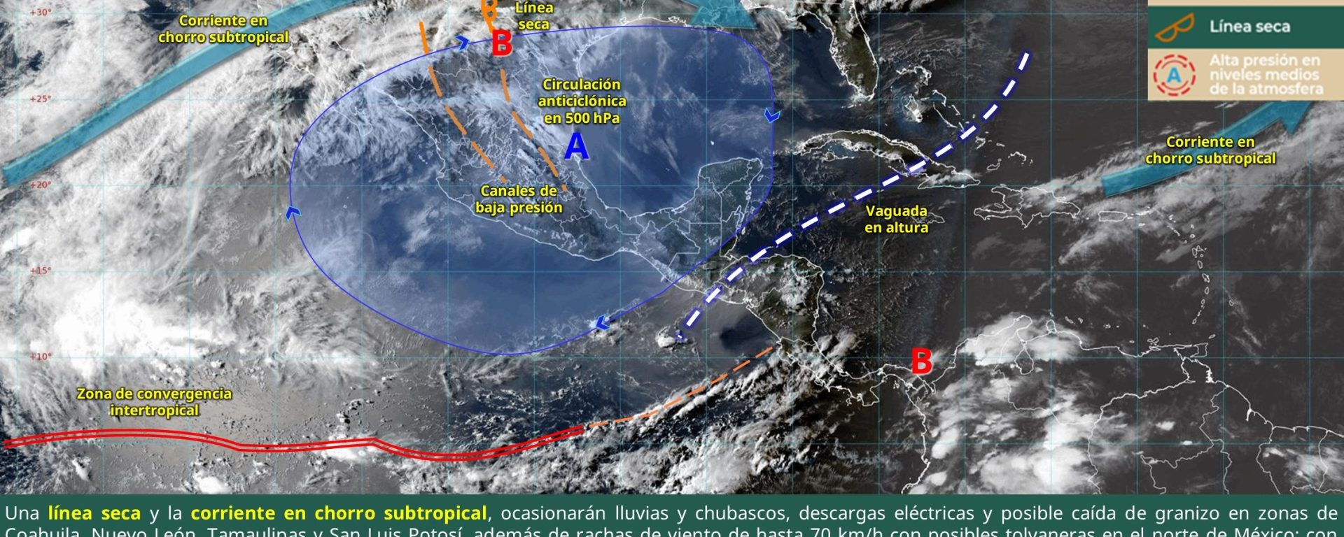 Viento de 30 a 40 km/h con rachas de 50 a 70 km/h: golfo de California, Baja California y Baja California Sur; con tolvaneras: Sonora, Chihuahua, Durango y San Luis Potosí; con probabilidad de formación de torbellinos: Coahuila (norte), Nuevo León (norte) y Tamaulipas (noroeste).