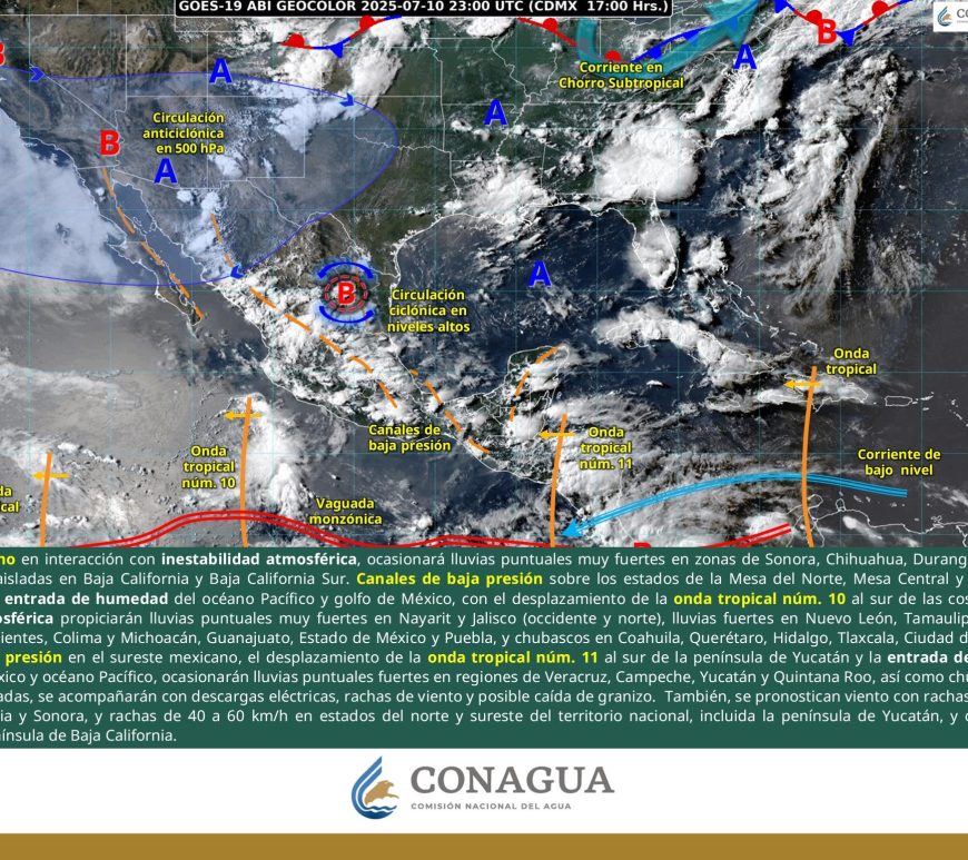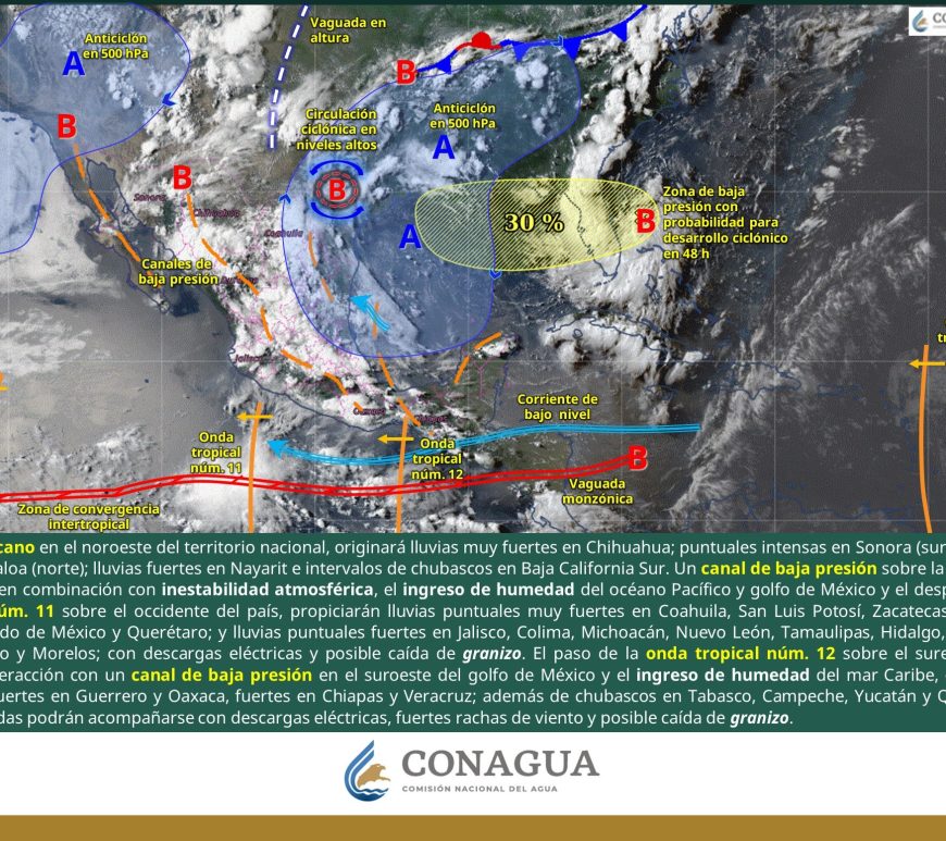 SE PRONOSTICAN LLUVIAS PUNTUALES MUY FUERTES EN EL NOROESTE, NORTE Y OCCIDENTE DEL PAÍS Se prevé cielo medio nublado a nublado con lluvias puntuales muy fuertes en Chihuahua, Coahuila y Durango, y lluvias puntuales fuertes Zacatecas; dichas lluvias podrían acompañarse con descargas eléctricas y posible caída de granizo, a su vez, originar encharcamientos, inundaciones y deslaves; además, ocasionar incremento en los niveles de ríos y arroyos. … Continúa leyendo Pronóstico Meteorológico