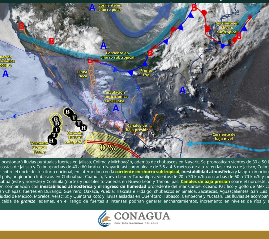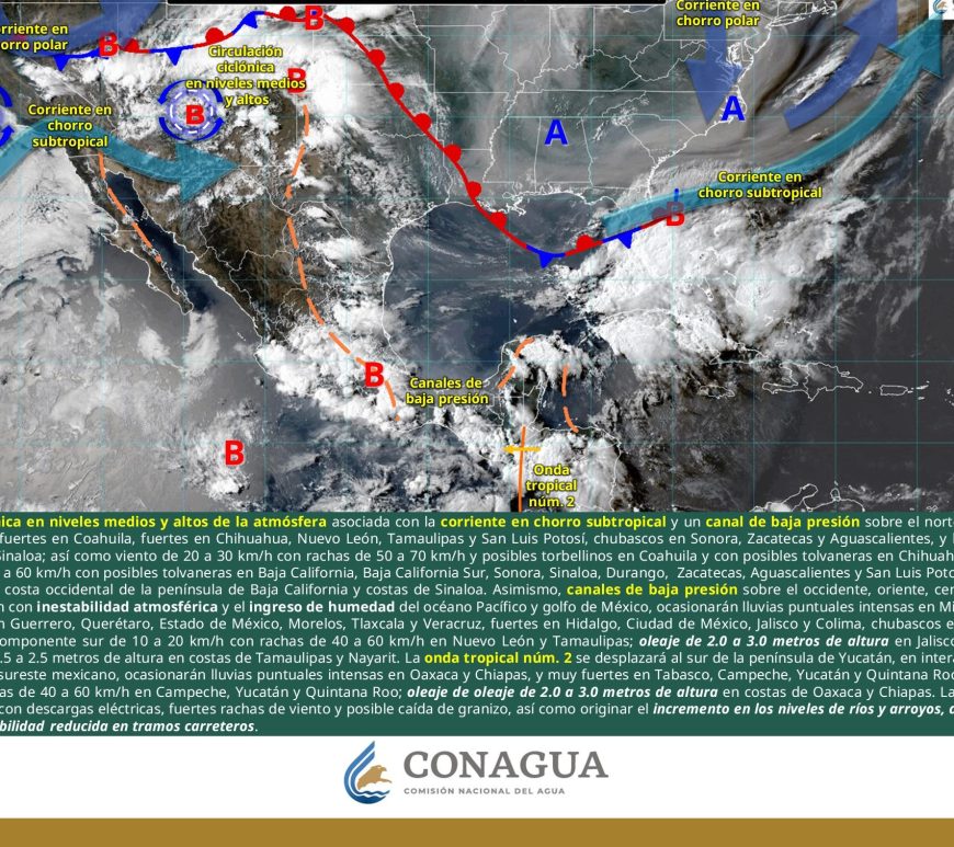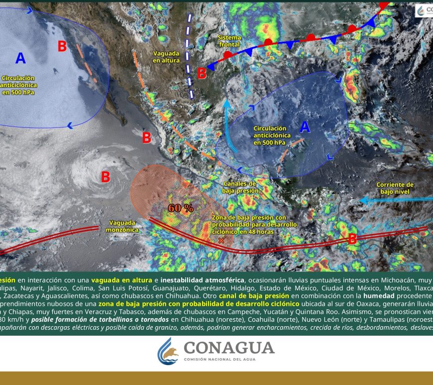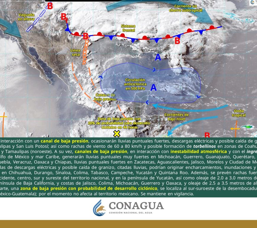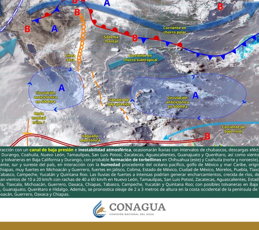 Por la mañana, cielo parcialmente nublado; ambiente de fresco a templado. Posibles lluvias aisladas matutinas en San Luis Potosí. Durante la tarde, cielo nublado con lluvias puntuales fuertes en Chihuahua, Durango, Coahuila y San Luis Potosí, las cuales podrían incrementar los niveles de ríos y arroyos, generar deslaves, inundaciones, encharcamientos y visibilidad reducida, además de chubascos en Nuevo León, Zacatecas y Aguascalientes. Todas con descargas eléctricas. … Continúa leyendo Pronóstico Meteorológico