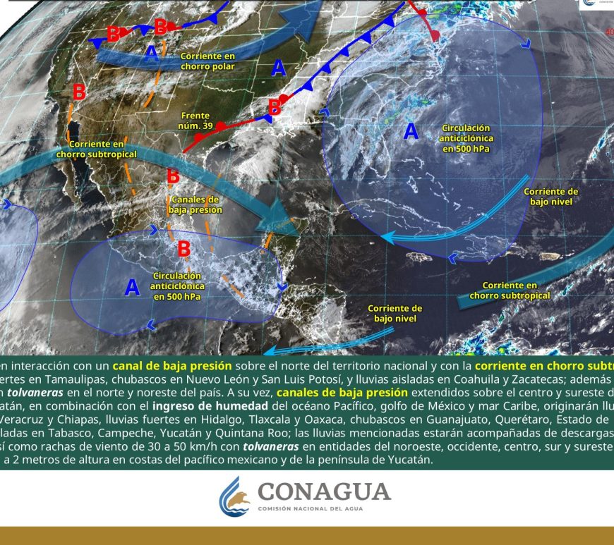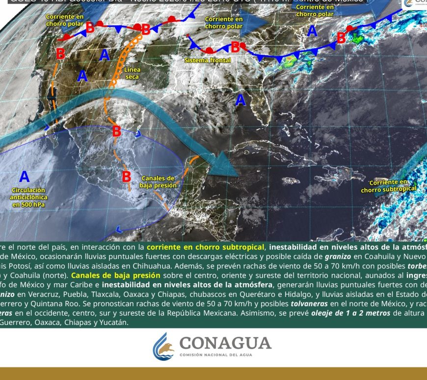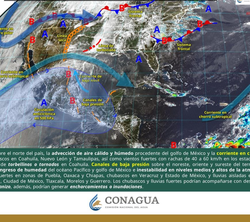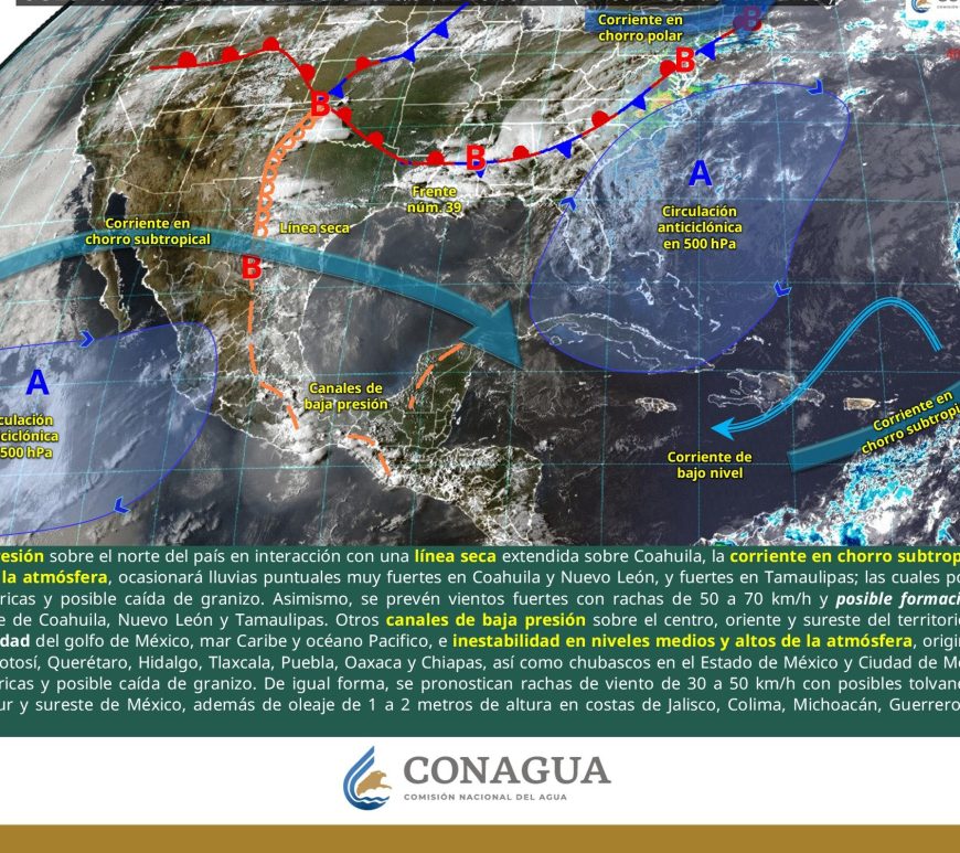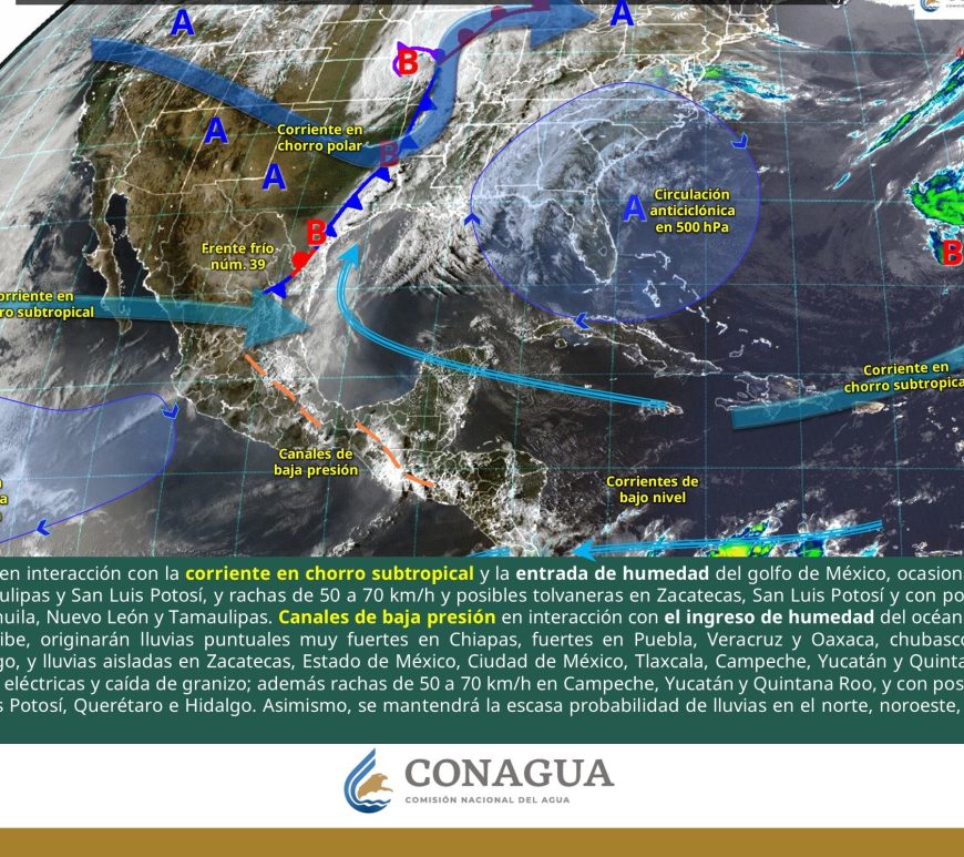 Pronóstico de lluvias Lluvias fuertes con puntuales muy fuertes (50 a 75 mm): Coahuila, Oaxaca y Chiapas.Chubascos con lluvias puntuales fuertes (25 a 50 mm): Nuevo León, Tamaulipas y Puebla.Intervalos de chubascos (5 a 25 mm): San Luis Potosí, Tlaxcala, Estado de México, Ciudad de México, Morelos y Veracruz.Lluvias aisladas (0.1 a 5 mm): Chihuahua, Querétaro, Michoacán, Guerrero, Campeche, Yucatán y Quintana Roo. Pronóstico de … Continúa leyendo Pronóstico Meteorológico 2 de Mayo