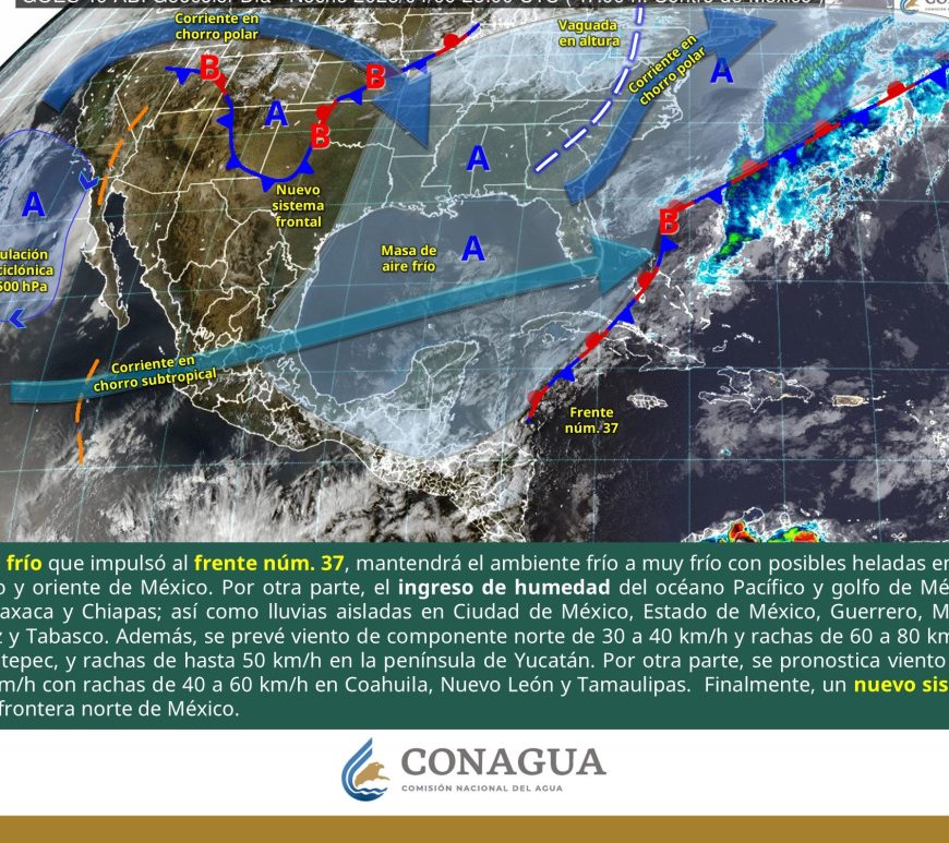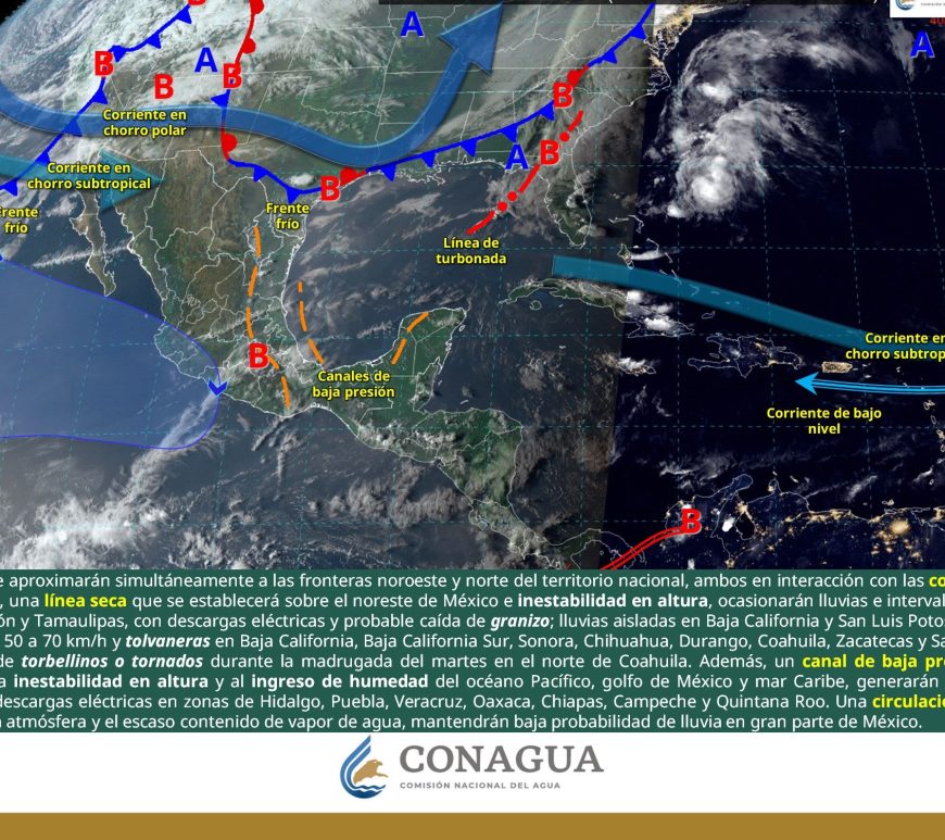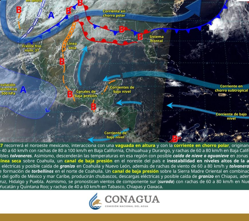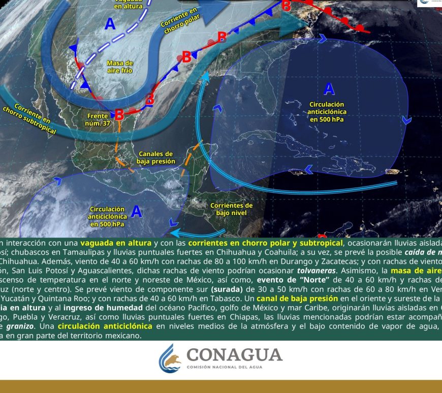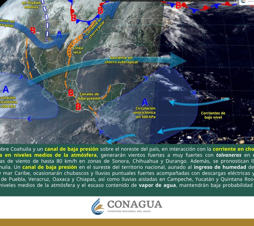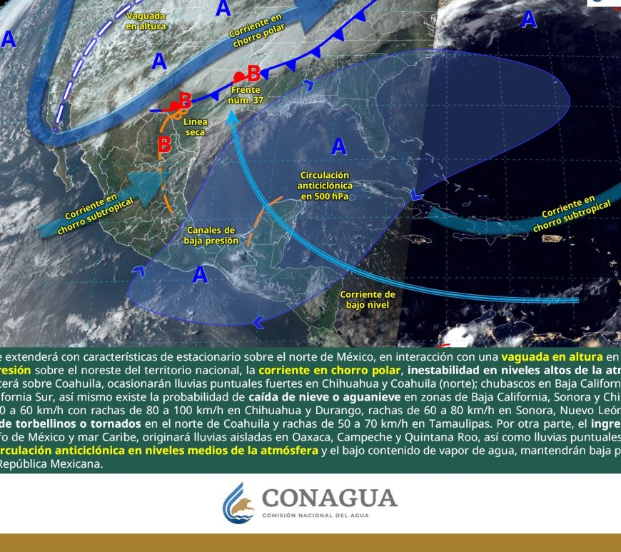 Cielo parcialmente nublado y sin lluvia en la región. Por la mañana, ambiente frío y muy frío a gélido en zonas serranas de Chihuahua y Durango. Por la tarde, ambiente caluroso a muy caluroso, con ambiente extremadamente caluroso en Chihuahua (suroeste). Viento de componente este de 20 a 30 km/h con rachas de 50 a 70 km/h y tolvaneras en Chihuahua, Coahuila, Nuevo León, Durango, Zacatecas, … Continúa leyendo Pronóstico Meteorológico 11 de Abril