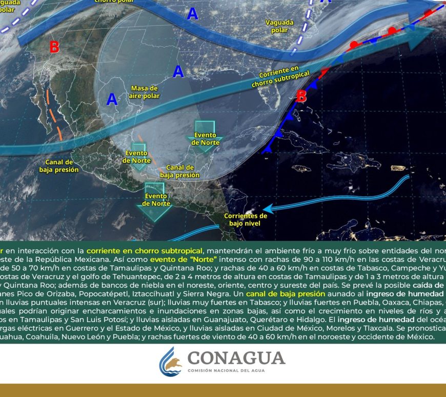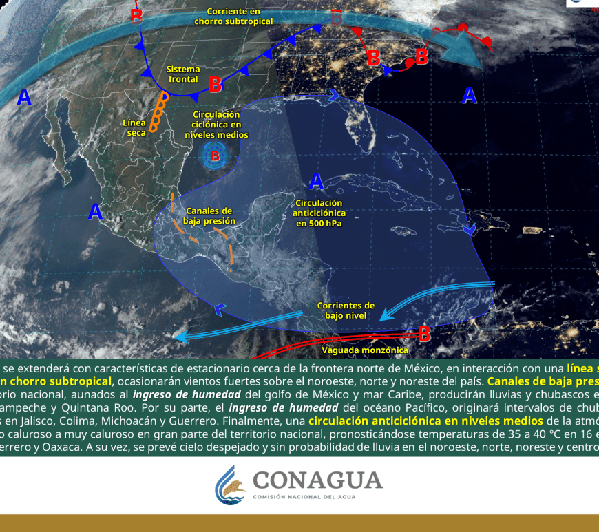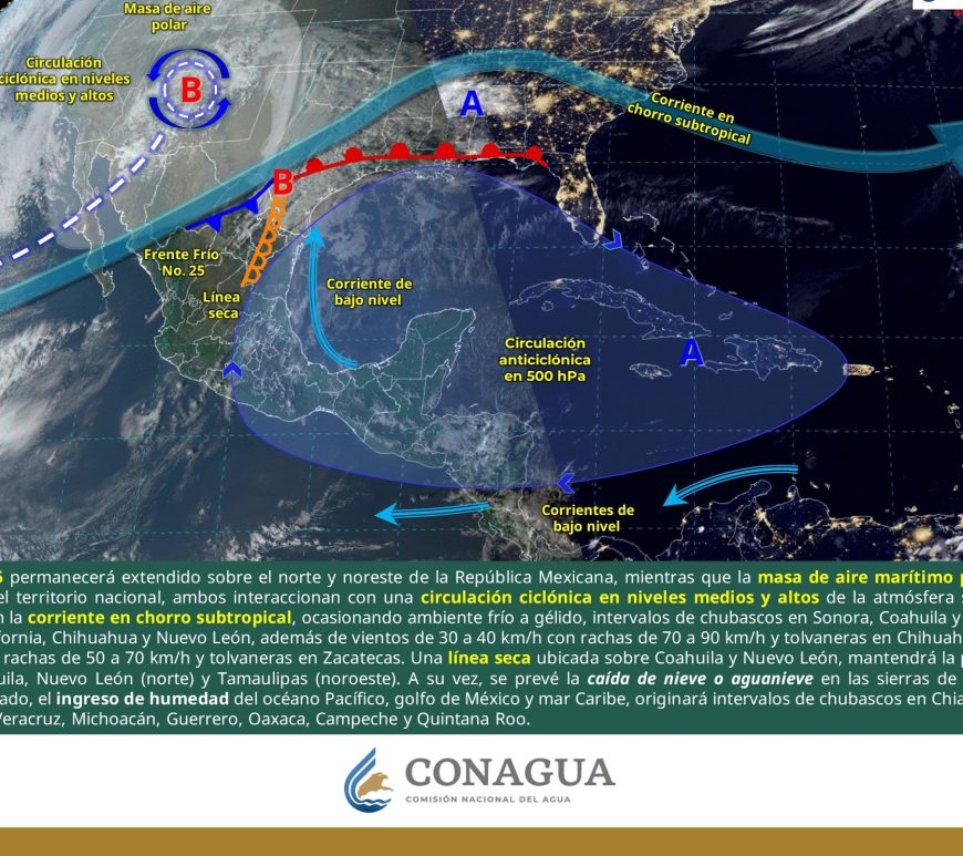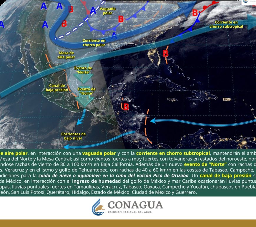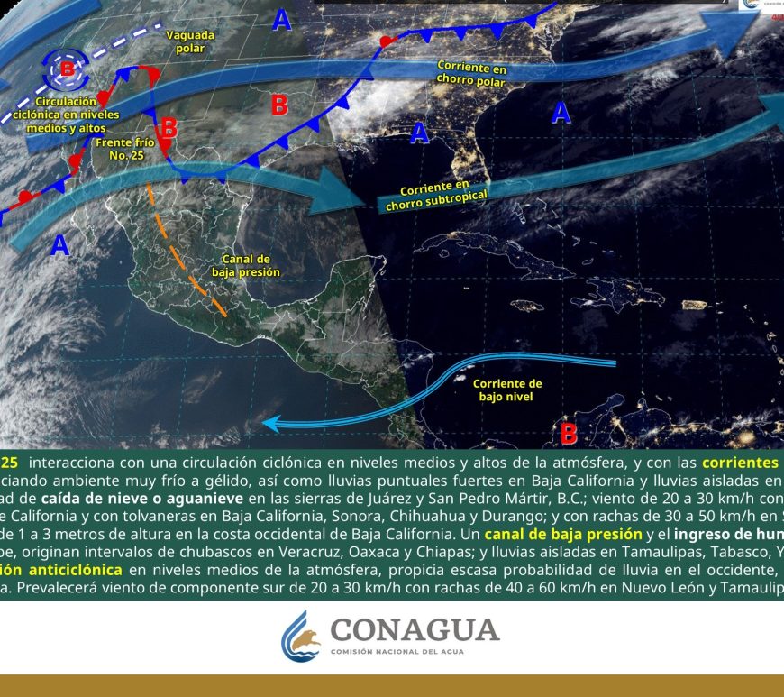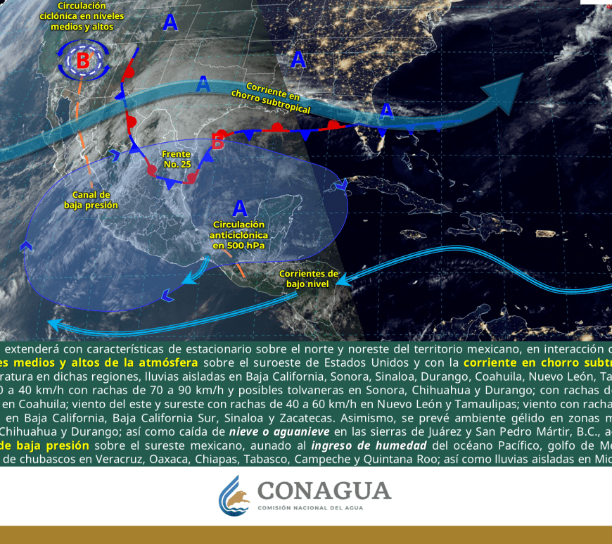 Cielo despejado y sin lluvia en la mayor parte de la región. Así como condiciones de cielo medio nublado con lluvias aisladas en el norte de Coahuila y Nuevo León. Ambiente frío a muy frío por la mañana y cálido a caluroso durante la tarde. Viento de dirección variable de 20 a 30 km/h con rachas de 40 a 60 km/h y posibles tolvaneras en Chihuahua y Durango, así como … Continúa leyendo Pronóstico Meteorológico 9 de Febrero