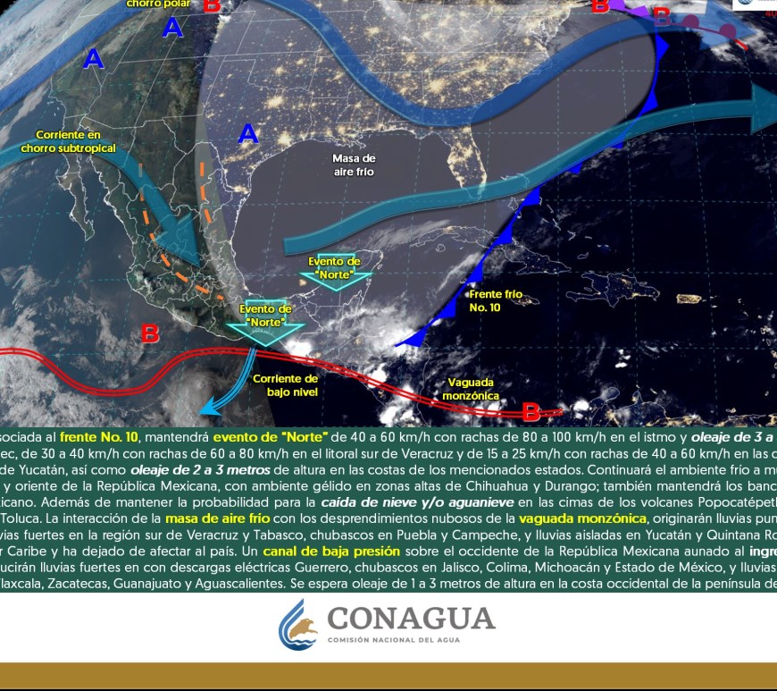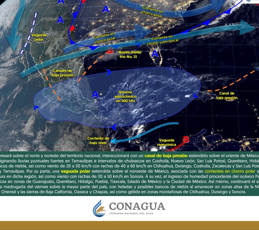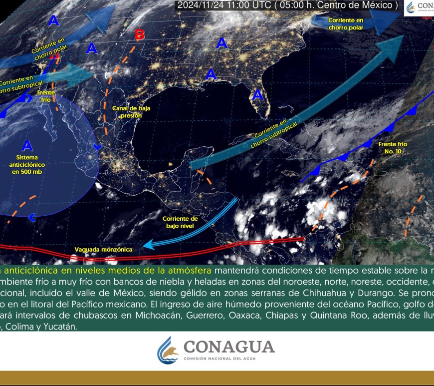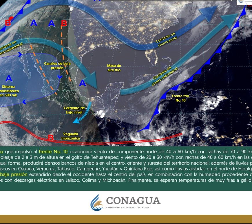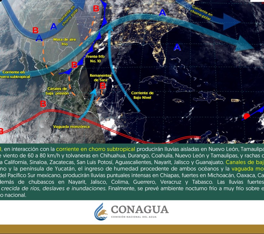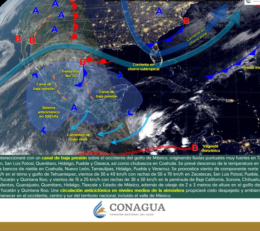 Cielo medio nublado a nublado durante el día, con bancos de niebla y lluvias puntuales fuertes en Coahuila, Nuevo León y San Luis Potosí, las cuales podrían ocasionar encharcamientos, inundaciones y deslaves, así como incrementar los niveles de ríos y arroyos; chubascos en Chihuahua y lluvias aisladas en Durango y Zacatecas. Sin lluvias en Aguascalientes. Ambiente matutino frío a muy frío en zonas altas de la … Continúa leyendo Pronóstico Meteorológico 6 de Diciembre