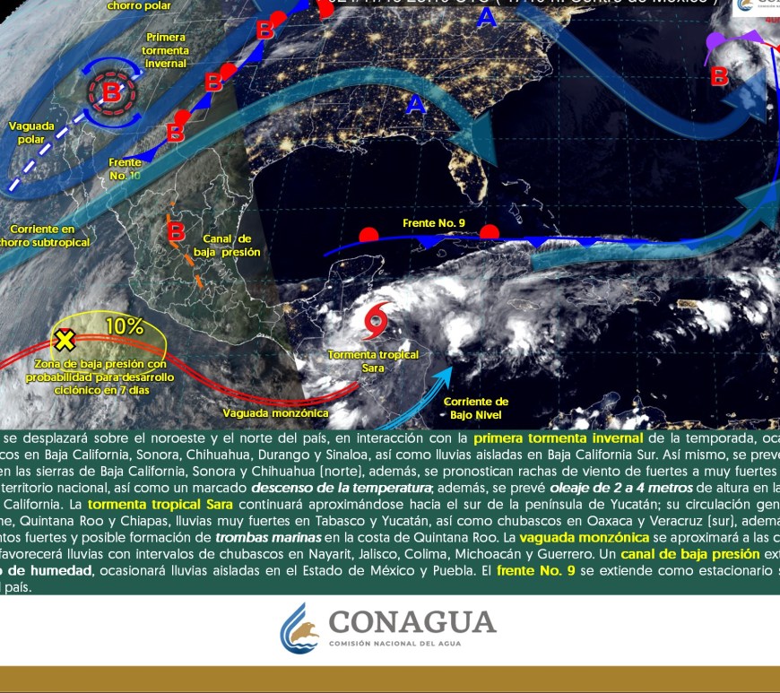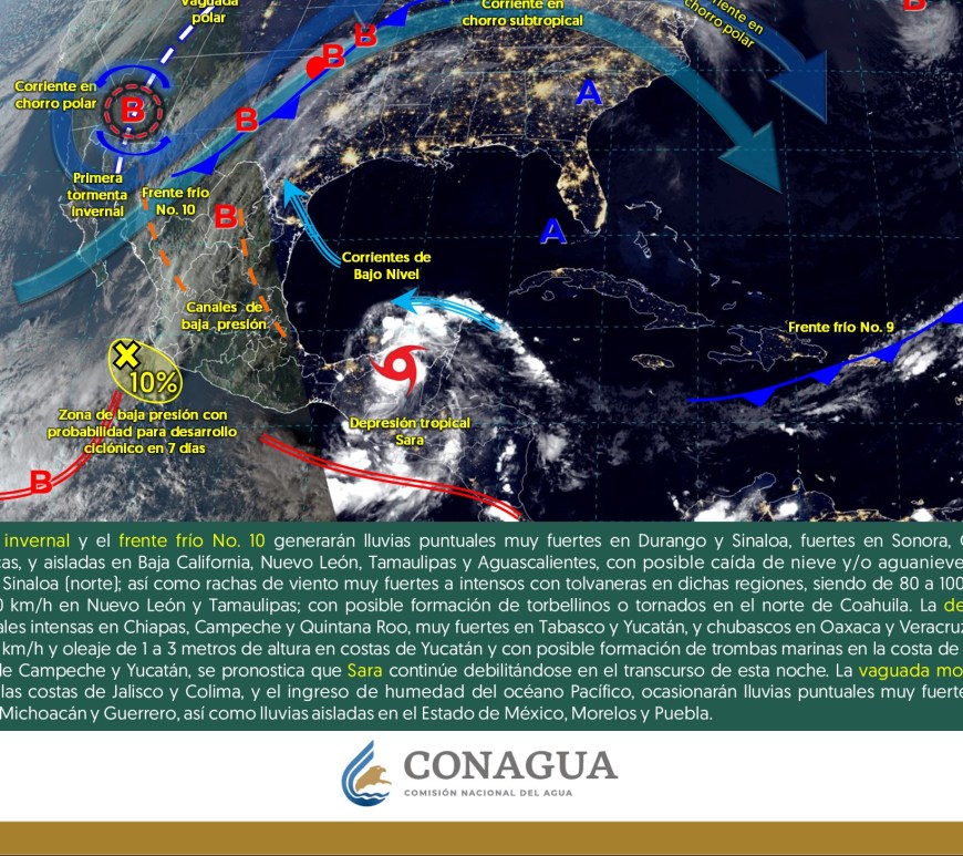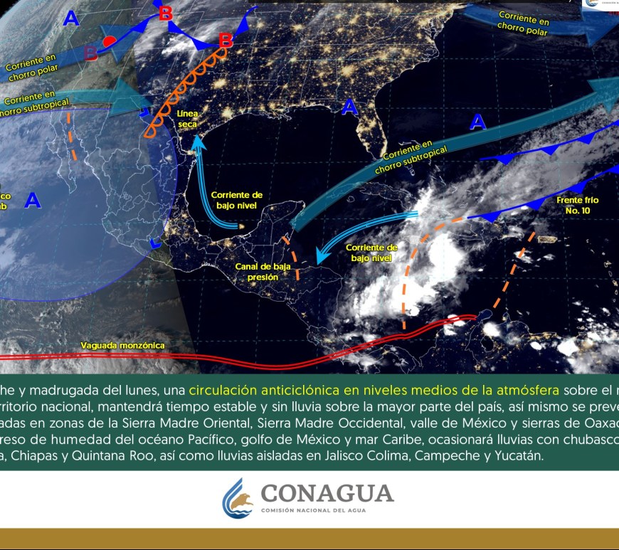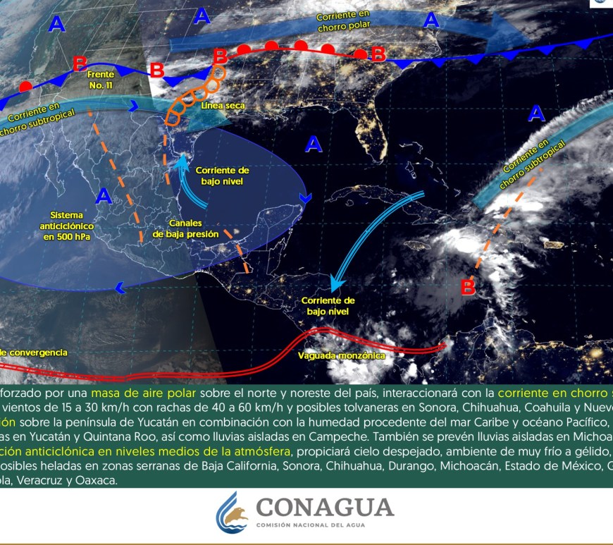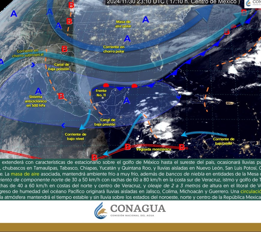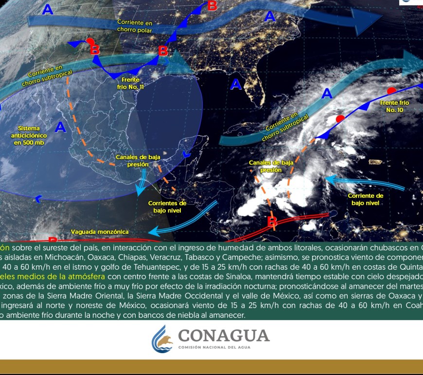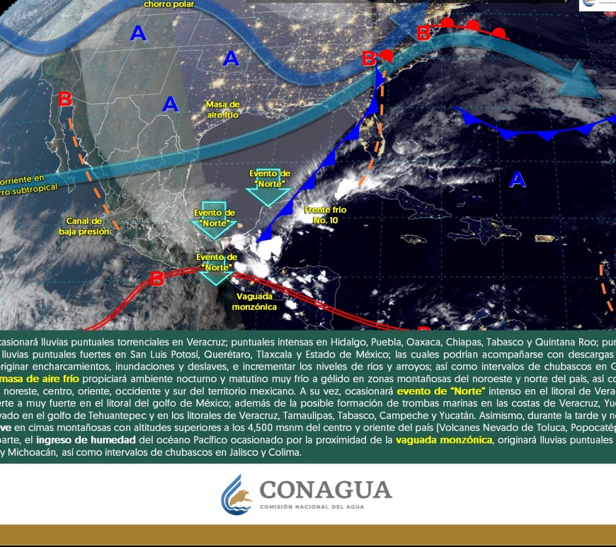 Cielo medio nublado a nublado durante el día, con bancos de niebla y lluvias puntuales fuertes en Coahuila, Nuevo León y San Luis Potosí, las cuales podrían ocasionar encharcamientos, inundaciones y deslaves, así como incrementar los niveles de ríos y arroyos; chubascos en Chihuahua y lluvias aisladas en Durango y Zacatecas. Sin lluvias en Aguascalientes. Ambiente matutino frío a muy frío en zonas altas de la … Continúa leyendo Pronóstico Meteorológico 6 de Diciembre