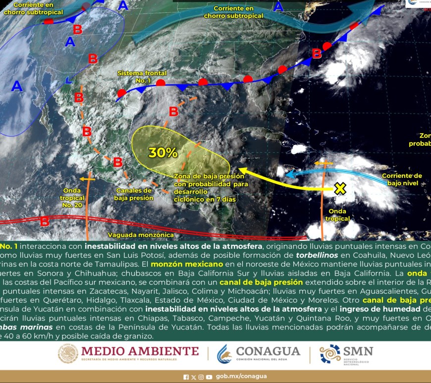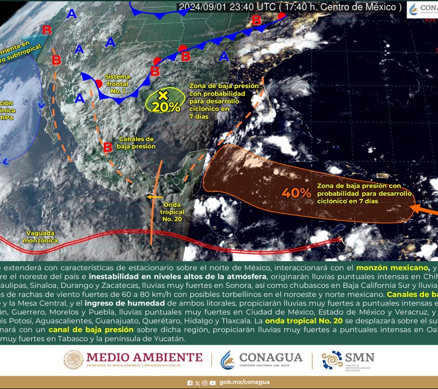 Por la mañana, cielo medio nublado con ambiente fresco a templado, y frío con bancos de niebla en zonas serranas. Cielo nublado con lluvias puntuales intensas en San Luis Potosí y fuertes en Nuevo León, Zacatecas y Aguascalientes; todas con descargas eléctricas y posible caída de granizo, además, podrían reducir la visibilidad, ocasionar inundaciones, deslaves y encharcamientos, e incrementar los niveles de ríos y arroyos. Ambiente cálido a … Continúa leyendo Pronóstico Meteorológico 16 de Septiembre